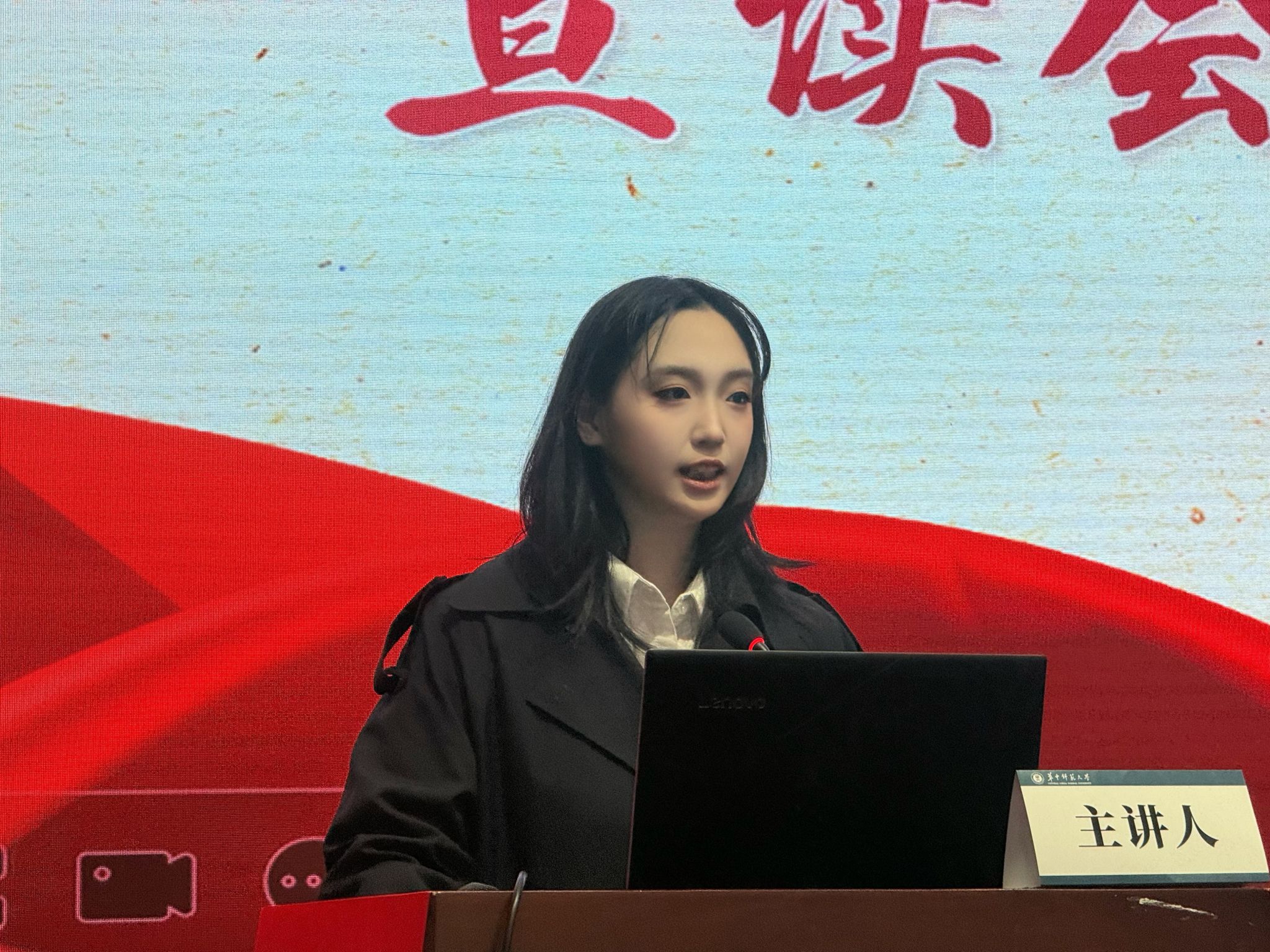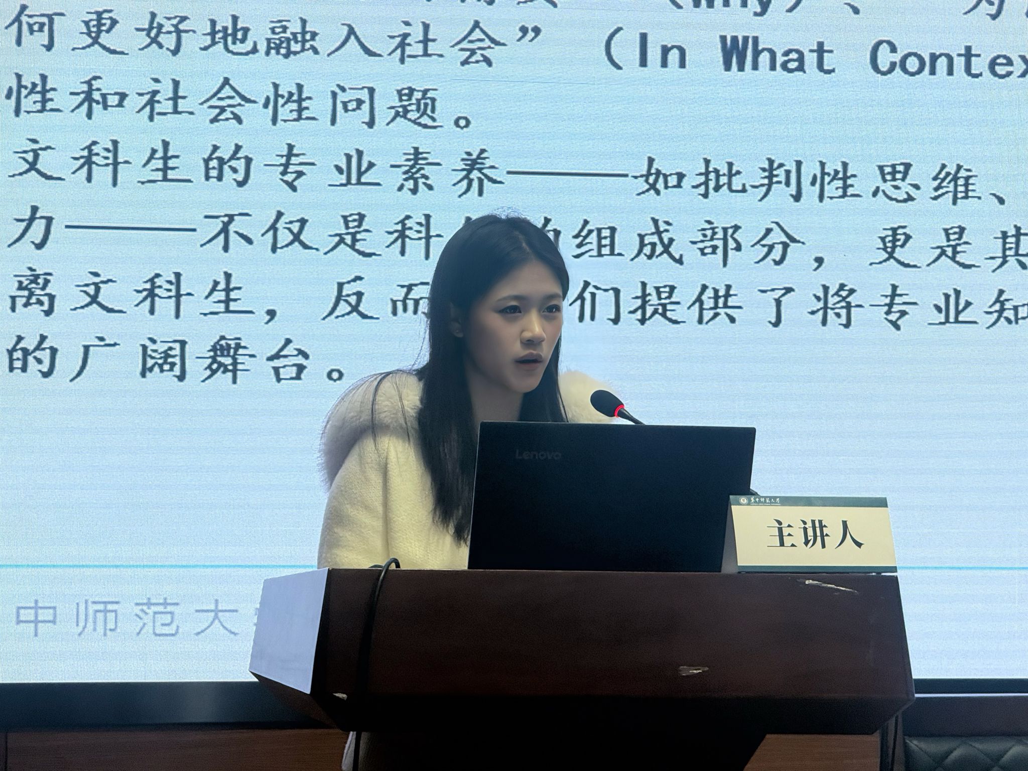 学生会主席团成员唐千慧以“擎科创凌云志,铸时代新青年——我院学子科创动力激发的多元路径探索”为题进行分享,为破除“科创离文科生很远”的刻板印象,从“造势者”、“塔台者”、“护航者”三个方面讲述了科创实践中心这个平台为我们进行科创提供的便利和机遇。她指出,作为学生骨干,应该紧跟时代发展潮流,积极参与科创,挖掘和发挥文科生在科创活动中的独特价值,实现多元化融合发展。