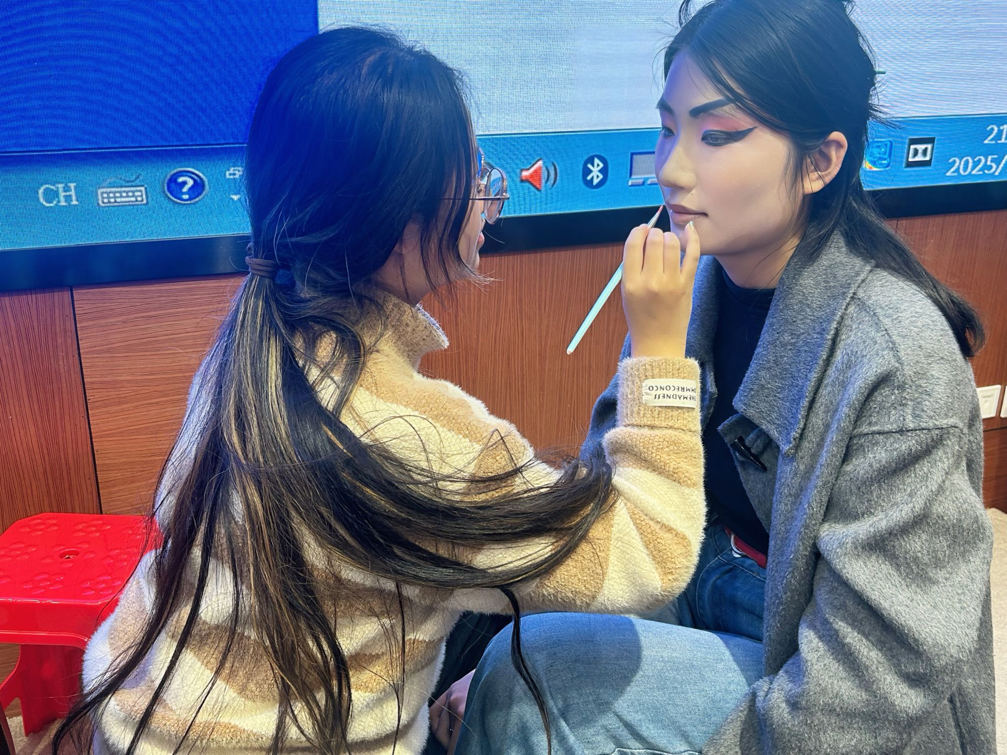 在台下的同学们专心致志地绘制京剧脸谱的同时,本次活动特别设置的京剧脸谱绘制体验环节也拉开了帷幕。两位踊跃报名的同学走上台前,由来自美术学院的华韵京剧社成员武文博为他们绘制面部脸谱,沉浸式感受京剧艺术的独特魅力。