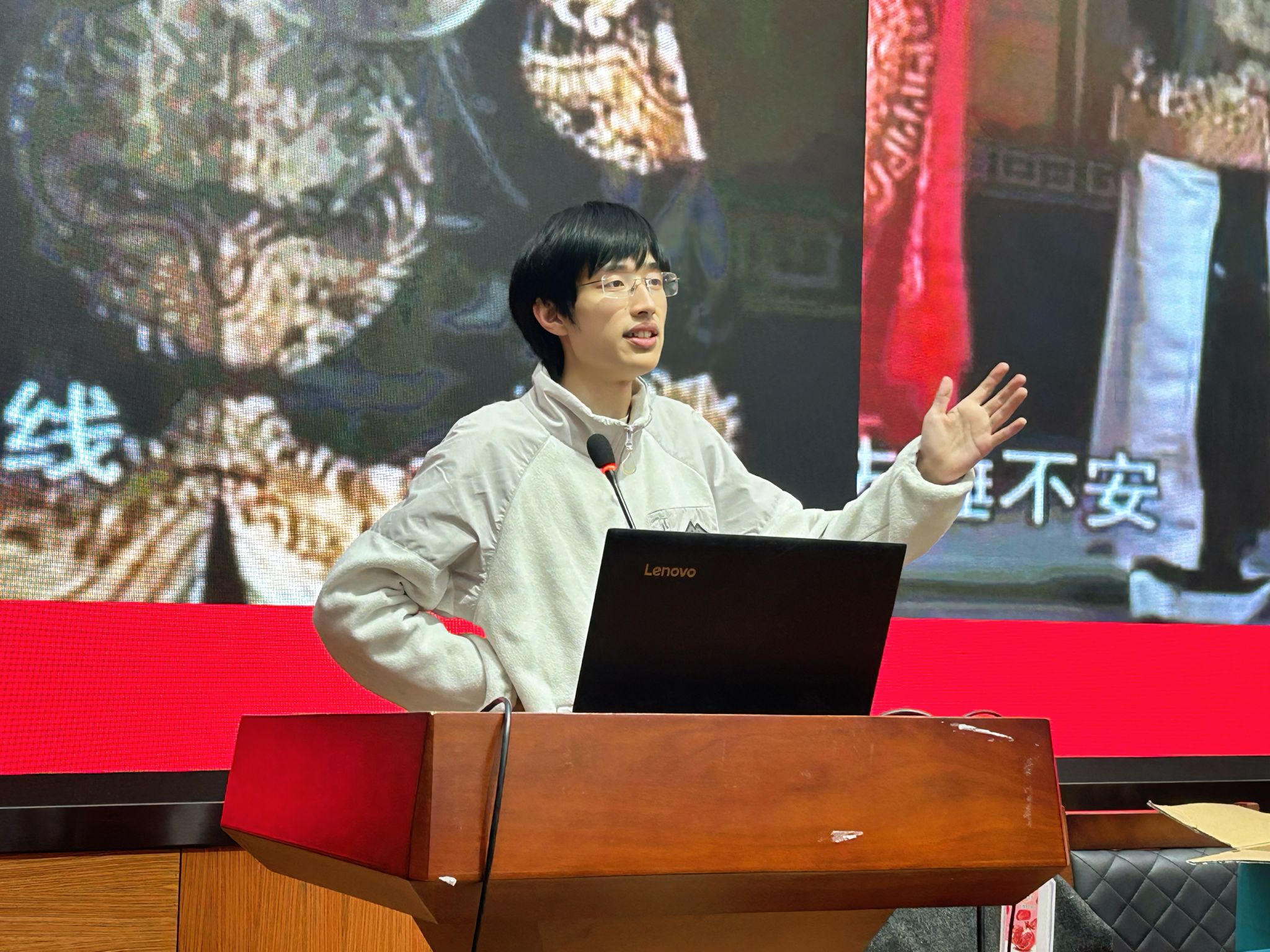 华韵京剧社社长刘子穆率先登场,为在场同学铺开了京剧文化的生动画卷:他先以“脸谱”为引,拆解不同色彩背后的人物性格特点,红脸的忠勇、白脸的奸猾、黑脸的刚正,让脸谱不再是单调的图案,而是鲜活的角色写照;随后又详解京剧中的“行头”,从蟒袍的纹样到褶裙的形制,道尽戏曲服饰的美学与规制。