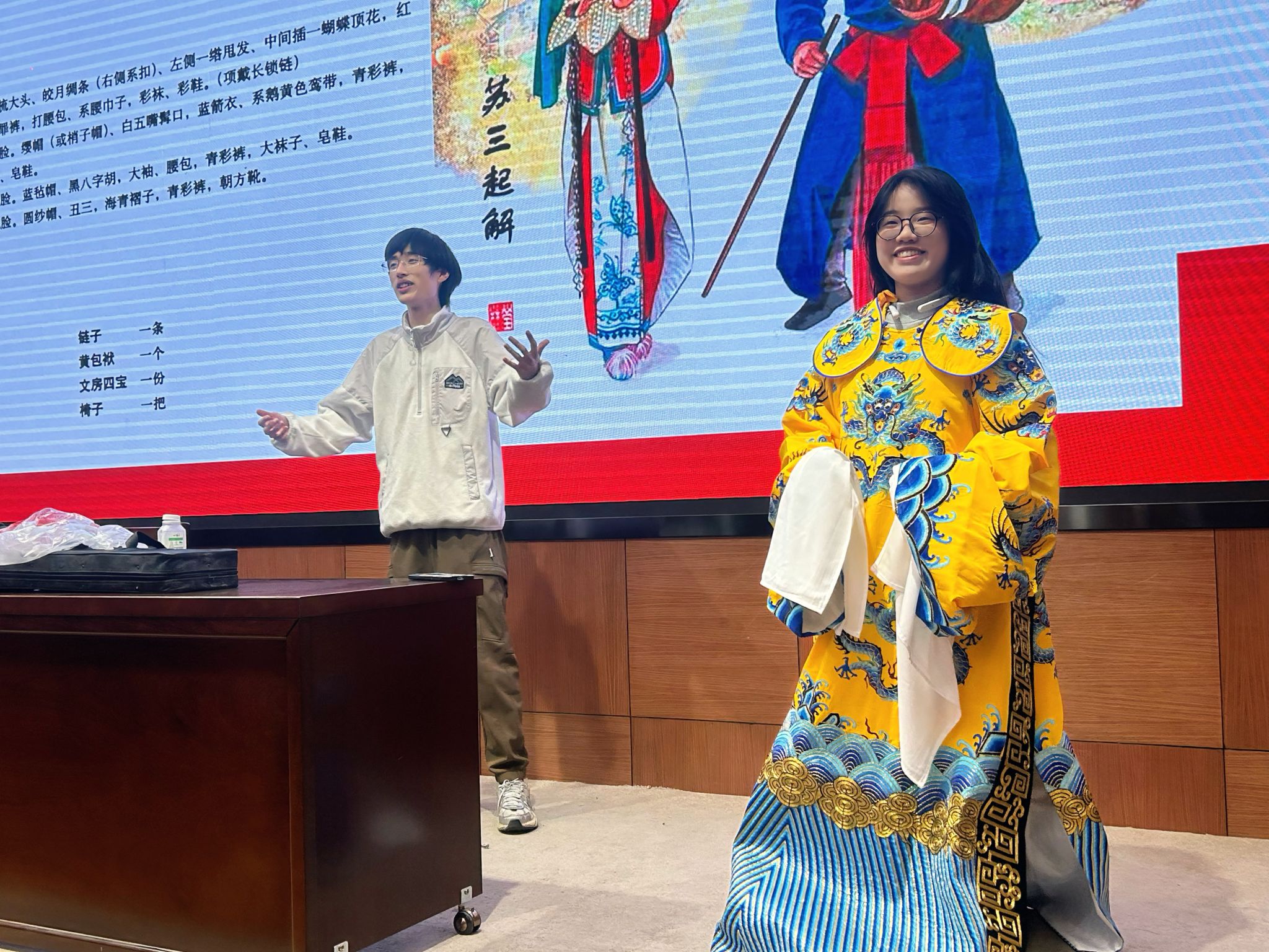 讲到京剧中的服饰,刘子穆热情邀请同学们走上舞台,亲身感受京剧服饰的魅力与底蕴。现场展示了华美精致的“蟒袍”,其纹样繁复、色彩浓郁,尽显传统戏曲的庄重与华丽;另有诸葛亮形象的戏服,素雅中透露着睿智,引得同学们纷纷试穿体验,这一环节不仅拉近了同学们与传统艺术的距离,更让大家在亲身体验中加深了对京剧文化的理解。