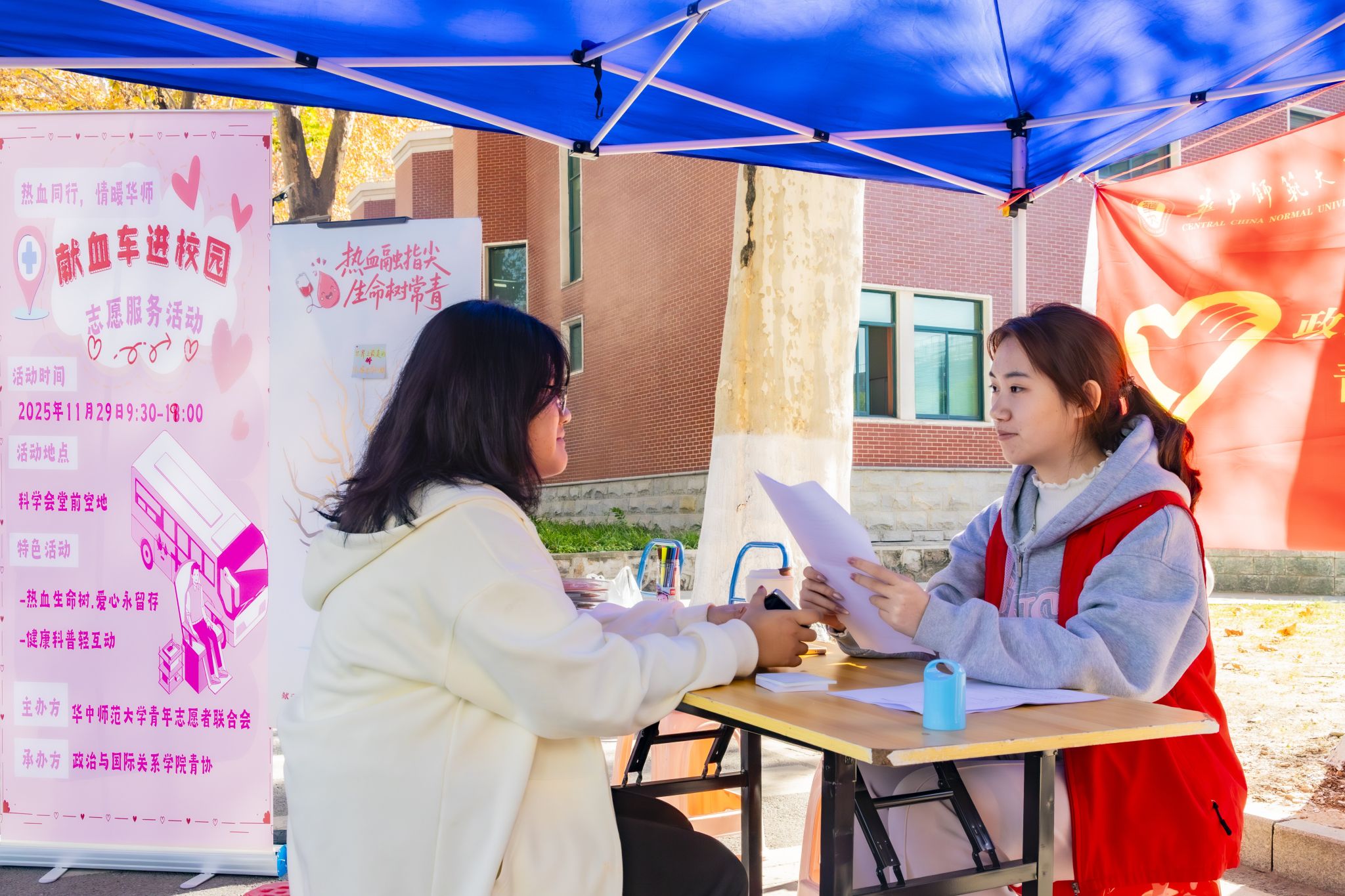 华大青年讯(通讯员 张丹 张凯楠)为响应健康中国战略号召,传递无偿献血的公益力量,11月29日,“热血同行,情暖华师”献血车进校园活动在华中师范大学科学会堂门口开展。此次活动是政治与国际关系学院青年志愿者协会(以下简称“政国青协”)首次通过竞标成功承办的校园公益志愿服务活动,24名志愿者全程护航,以专业服务筑牢保障,让“奉献、友爱、互助、进步”的志愿精神与“爱在华师”的温情理念同频共振,让公益暖意与青春担当在校园里传递蔓延。
