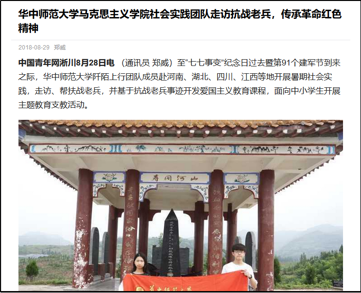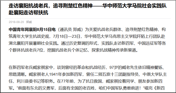 事实上,在实践后的很长时间,郑威才明白实践的真正价值究竟有多大。战争带不走的,终究会被时间带走,他们陆续收到了几位抗战老兵英魂归队的消息,那时的讲述成为了绝响。也正是通过这次实践,郑威对大学生涯有了更深层的规划——在全面发展自身的同时,要努力创造、实现自身的社会价值,在投身社会实践中实现青年担当。