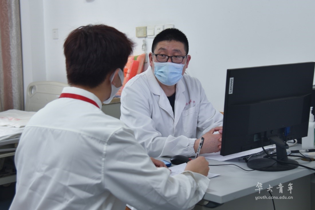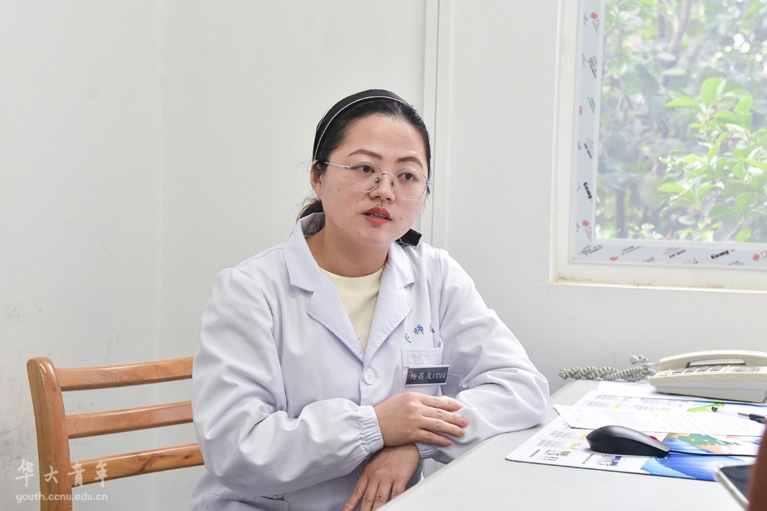 自2018年来到华师校医院起,荣太梓医生便一直在内科诊室工作。“在校医院,我主要从事内科病房、门急诊、医疗保健、健康资讯以及抗疫工作。”面对我们的到来,荣太梓放下手中正在整理的工作资料,简单为我们介绍了他的工作职责。