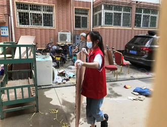 美术学院2018级学生连世洁第一时间加入到家乡的抗洪青年志愿队伍。除了帮助行动不便的老人清理住所,疏解道路交通,连世洁还当起了“志愿者的志愿者”,为参与物资搬运的青年志愿者摄影,为他们加油鼓气。