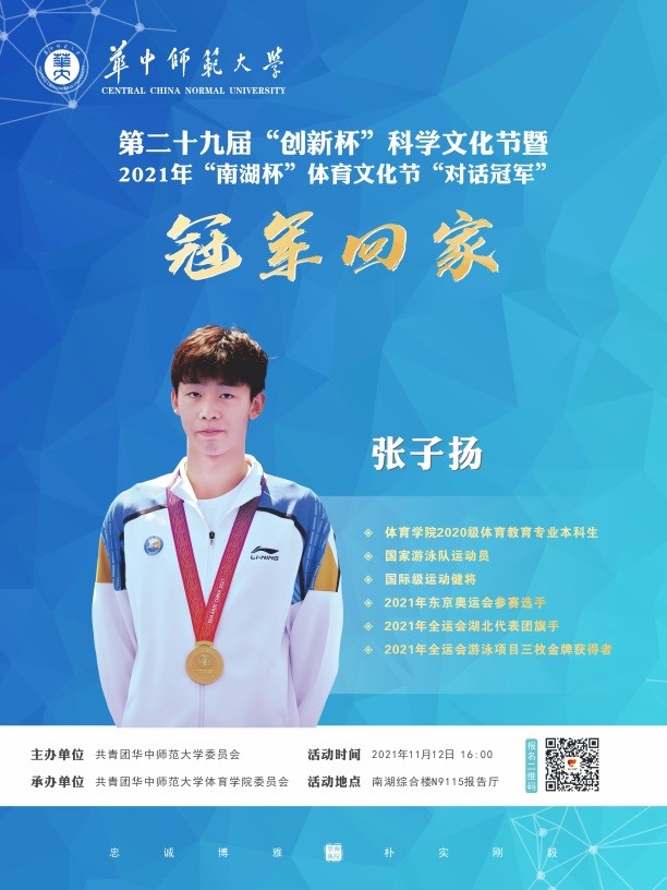 华大青年讯(文字 王一好 吴佩轩 摄影 鲁璟毅 孙宁 吕柯言)11月12日下午,华中师范大学第二十九届“创新杯”科学文化节“冠军回家”暨2021年“南湖杯”体育文化节“对话冠军”活动在南湖综合楼N9115报告厅举行。活动邀请体育学院2020级体育教育专业本科生、国家游泳队运动员、国际级运动健将张子扬作为嘉宾,分享训练心得、交流成功经验。