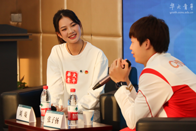 张子扬也向几位体育学院的同学提问,了解他们的生活和未来规划,并与他们探讨了如何克服赛前紧张情绪、如何做到自律等专业问题。在场同学与张子扬进行了深入的交流,从自身经历、个人感悟等角度各抒己见,现场气氛再次达到高潮。