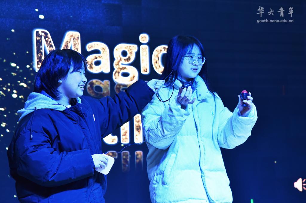 在节目表演环节,魔术协会带来魔术《再来一瓶》,酒瓶和水在一声响指后悄然调换位置,引起在场观众掌声不断。影像艺术部的歌曲串烧,从《这世界这么多人》《想见你想见你》到《被驯服的象》与《野狼disco》,温情与欢快躁动的转换再次带动全场气氛。在欢庆华大青年成立22周年的同时,华青人们也怀着爱党爱国之心,不忘庆祝我们党的百年生日。新闻部的集体朗诵《我们的精神之旅》,带大家回顾党的百年征程。