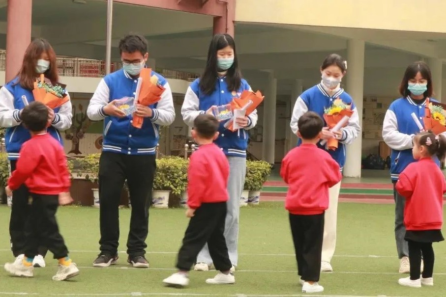 每日早晨和傍晚,华师幼儿园的校门口都有来自华中师范大学的青年志愿者主动陪同小朋友们过马路,及时提醒行驶车辆减速慢行。在过去的2021年里,共计560名青年志愿者参与爱心护学,累计志愿时长达420小时。值此雷锋月之际,华师幼儿园和学校保卫处组织了志愿者护学岗表彰大会。在表彰大会上,小朋友们为5名优秀志愿者代表颁发荣誉证书、赠送花束,将 “爱在华师”写进实际,让雷锋精神代代相传。