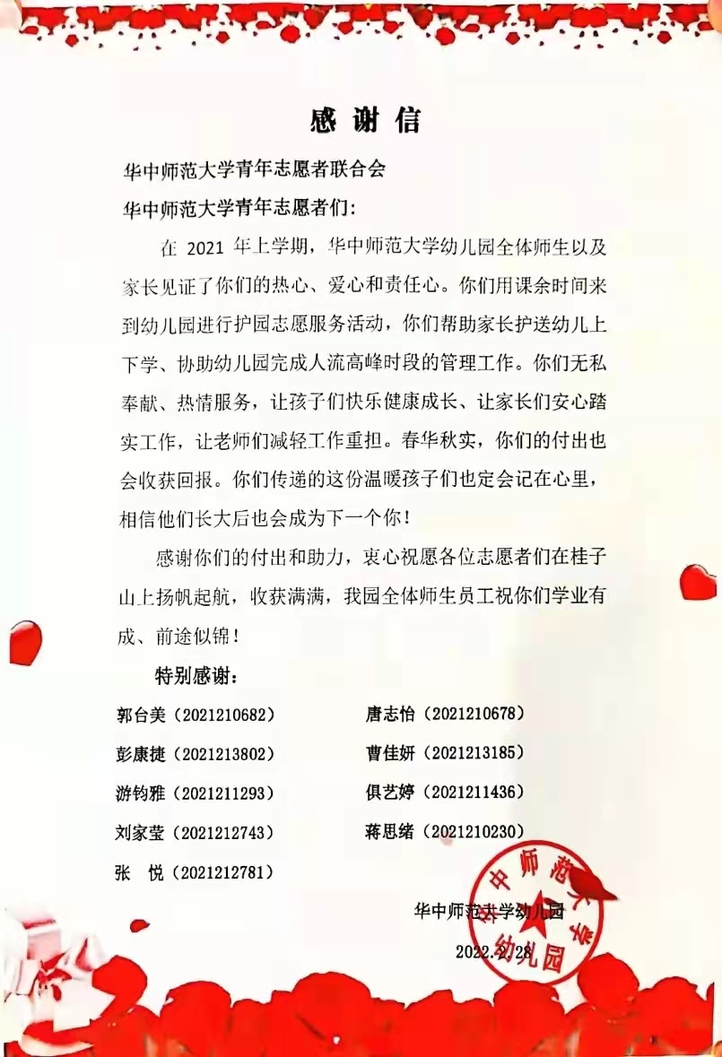 大手牵小手,守护上学路。每天早上和傍晚,在华师幼儿园的校门口都有我校青年志愿者主动陪同小朋友们过马路、及时提醒行驶车辆减速慢行。过去一年中共计560名青年志愿者参与爱心护学,累计志愿时长达420小时。雷锋月到来之际,华师幼儿园和学校保卫处组织了志愿者护学岗表彰大会,小朋友们为5名优秀志愿者代表颁发荣誉证书并赠送花束。这是爱在华师的生动写照,更是雷锋精神的时代传承。
