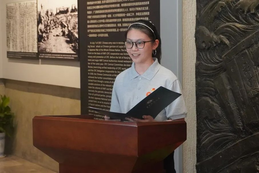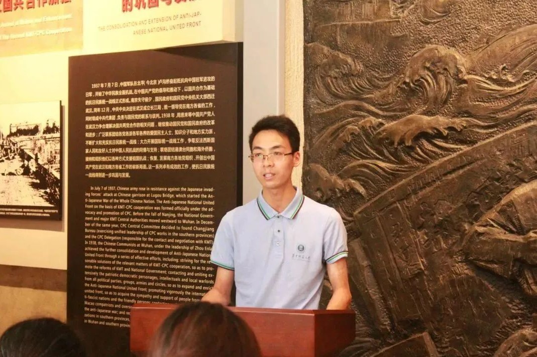 随后,麻旎与张帆共同为“华中师范大学青年志愿者教育实践基地”揭牌,正式宣告华中师范大学青年志愿者教育实践基地的建立。揭牌仪式后,参会人员跟随华中师范大学讲解志愿者和纪念馆讲解人员参观展览,从抗日民族统一战线的巩固与发展到抗日战争的全面胜利,参观人员在全面感受抗日战争的艰辛与中国共产党的智慧中,进一步接受红色文化的熏陶,感受红色血液的脉动。