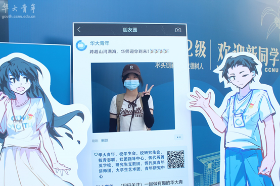 华大青年“小Q”的动漫形象展板及朋友圈合影框同样出现在桂子山校区北门、南门,吸引了众多新生合影留念,在他们心中留下一份青春活泼、热情开朗的华师初印象。