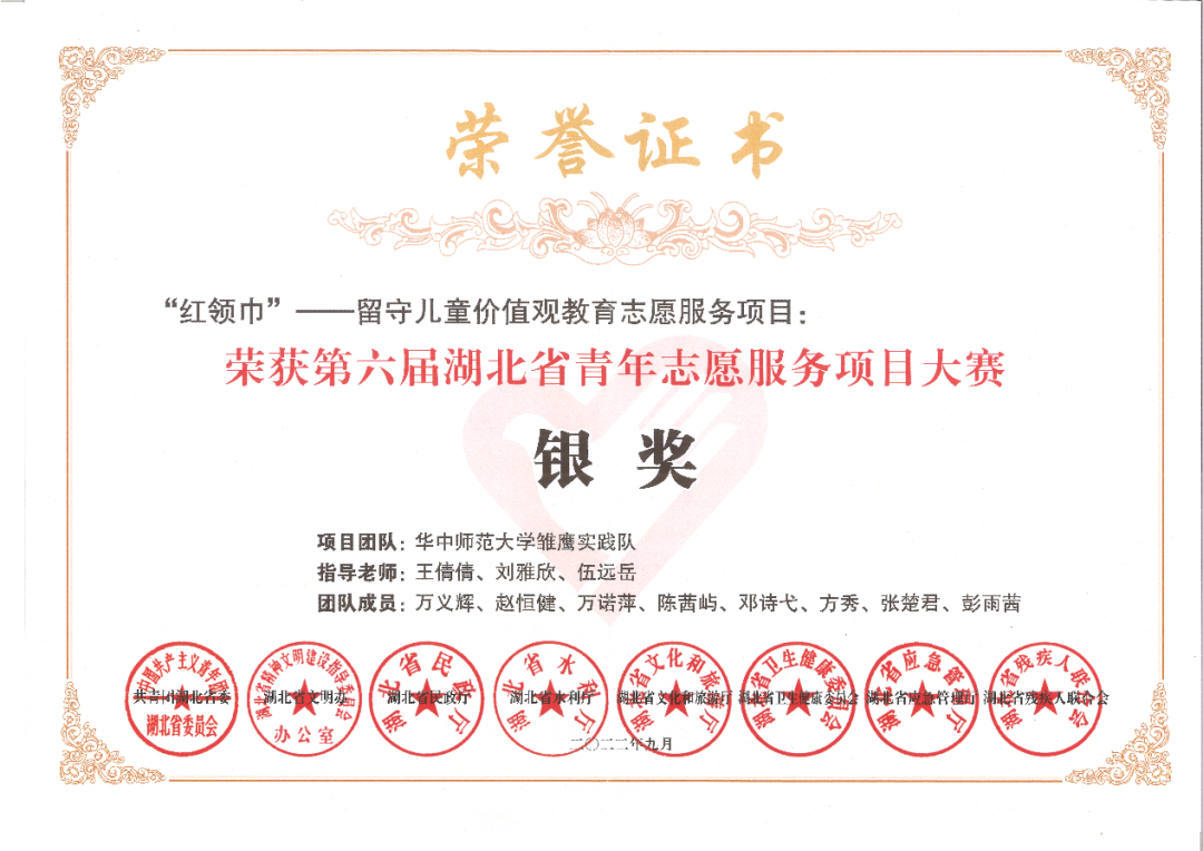 “红领巾”项目聚焦这一问题,通过推进官店镇“红”色资源进学校、进教材,设计出融合本土红色的社会主义核心价值观校本课程,形成“走当地—借理论—共开发—问效果”的可推广课程研发模式,引“领”留守儿童价值观塑造,并最终佩戴好“红领巾”,实现“入队入团入党”政治进步追求的人生三部曲。雏鹰实践队秉承“传播正能量,彰显真情怀、建设大格局”的理念,积极弘扬红色支教精神,打造一流服务品牌,助力乡村教育振兴。在第六届湖北省青年志愿服务项目大赛中获得了银奖的好成绩。