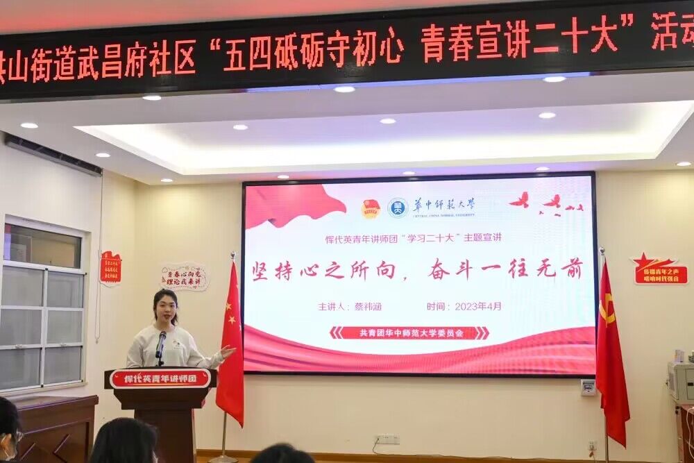 华大青年讯(文字 赵恒健 摄影 薛嘉雯)为扎实开展学习贯彻习近平新时代中国特色社会主义思想主题教育,推进党的二十大精神深入基层、走进社区,4月28日,恽代英青年讲师团走进武昌府社区,参加“五四砥砺守初心 青春宣讲二十大”主题活动,与社区党员干部、离退休老党员代表、其他高校学生志愿者热烈交流,以一次既有感召力、又有说服力的宣讲,推动学习贯彻习近平新时代中国特色社会主义思想走深走实。