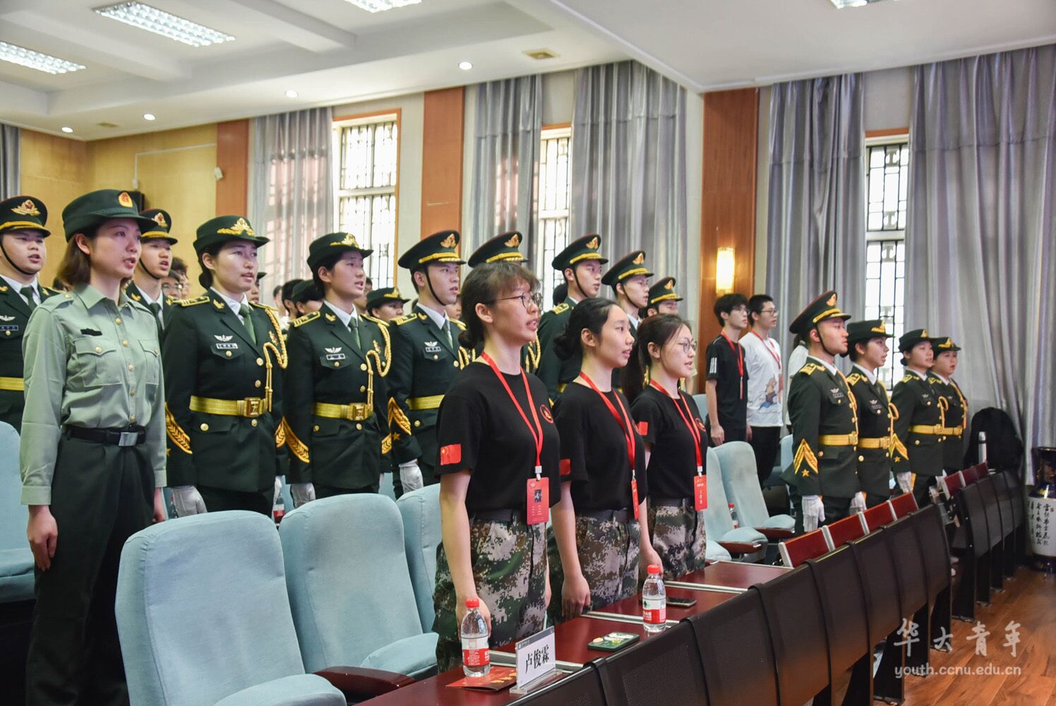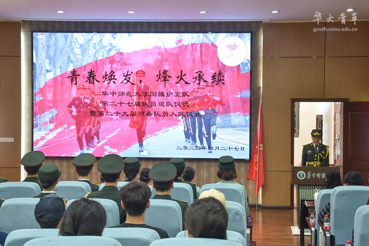 为进一步扩大国旗护卫队规模,加强队伍建设,增进与武汉各高校国旗护卫队的交流,4月27日上午,华中师范大学国旗护卫队第27届队员退队仪式与第29届预备队员入队仪式暨武汉高校国旗护卫队交流活动于文学院一楼报告厅举行。国旗护卫队指导老师卢俊霖,国旗护卫队第27届、28届、29届队员,在校往届队员,武汉市11所高校国旗护卫队(国旗仪仗队/国旗班)成员参加本次活动,我校国旗护卫队第29届队长侯秋煜主持活动。