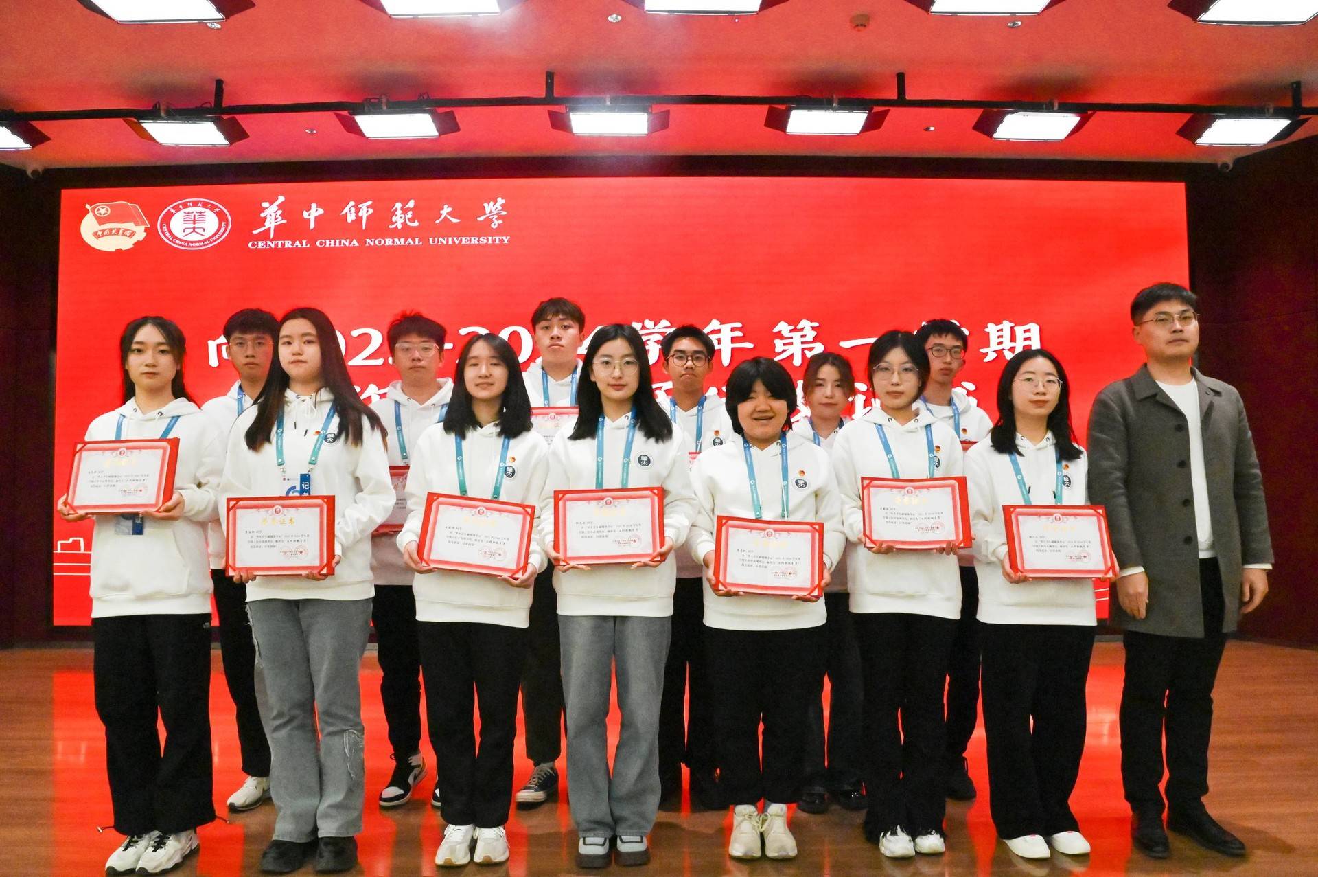 卢俊霖向2023-2024学年第一学期工作积极分子颁发证书。苏晓刚向2023-2024学年优秀记者颁发证书。雷宇向2022-2023学年主要学生骨干代表颁发纪念牌。