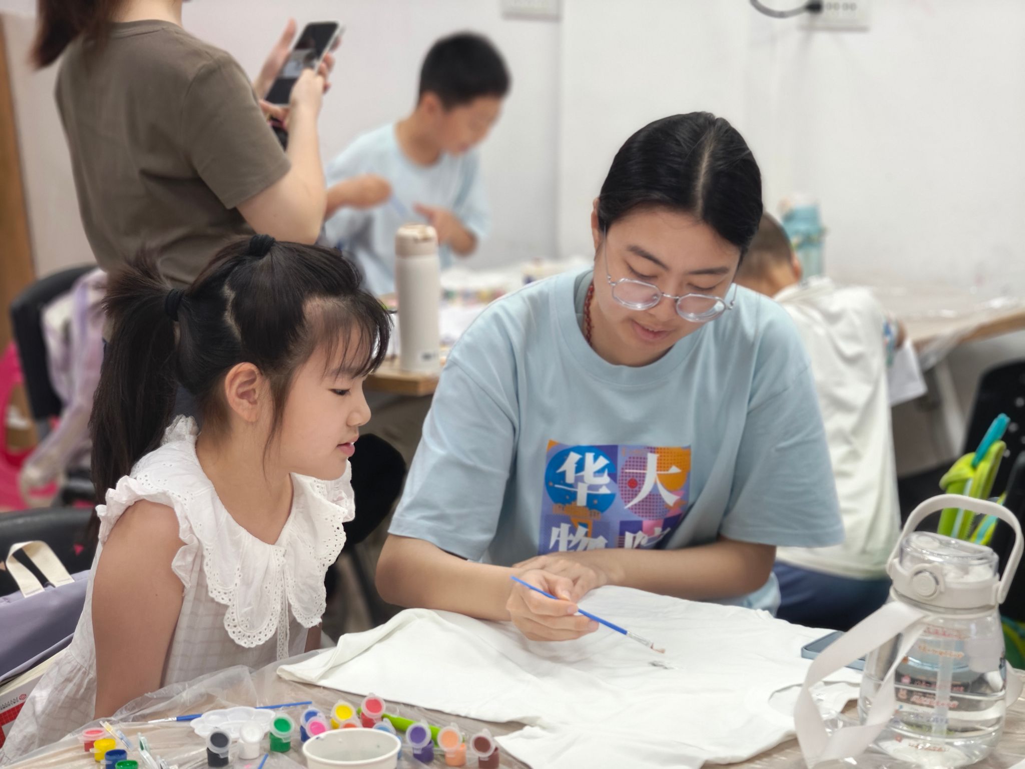 华大青年讯(通讯员 魏清)7月17日,华中师范大学物理科学与技术学院“格致科普·‘团’聚青春”社区科普实践队琴台社区分队,携手汉阳区民政未成年人保护中心,在琴台社区开启了一场别开生面的创意绘画活动。孩子们以白T恤为画布,用斑斓画笔勾勒奇思妙想,让社区洋溢着艺术与童趣的气息。