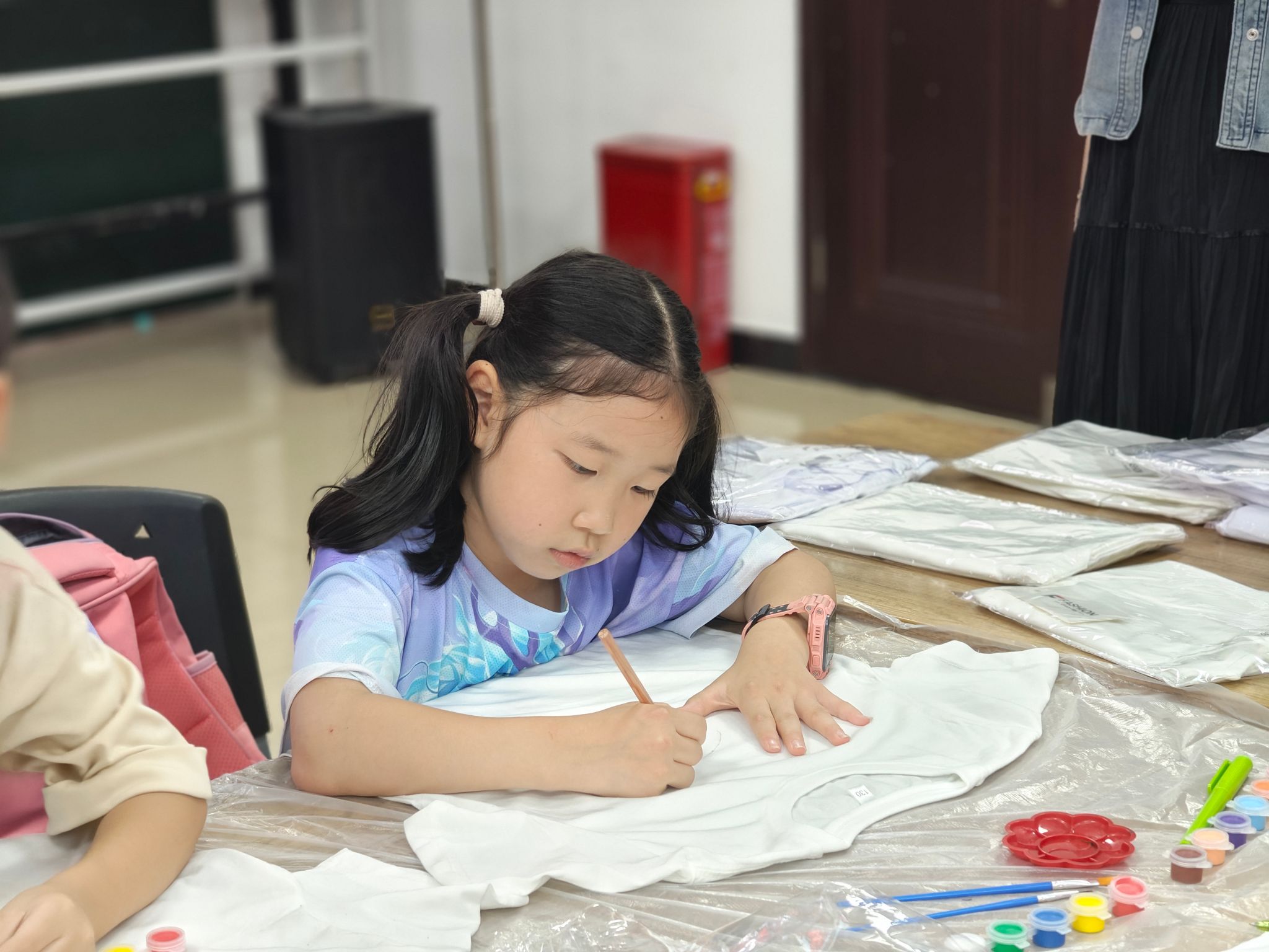 孩子们在白色T恤上专注地进行绘画创作。有的选择粉紫色调绘制卡通图案,有的运用多种色彩,大胆组合成想象力十足的图案。实践队成员在一旁指导调色方法和构图技巧,帮助孩子们完成作品。活动现场气氛活跃,充满交流互动的学习氛围。