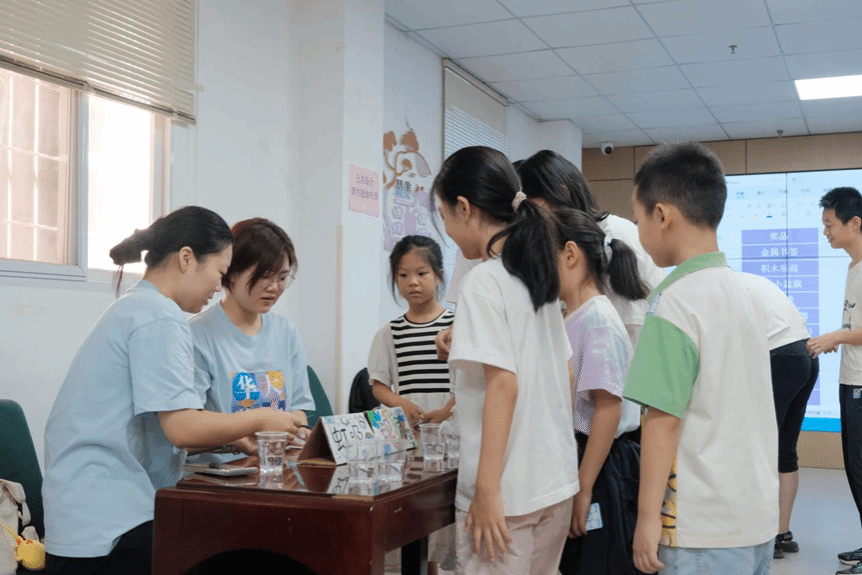 实践队成员余佳雨和唐佳佳负责的“虹吸现象”实验同样引人入胜。孩子们利用一根吸管将两个水位高度不同的杯子连接,观察水如何从高水位杯子自动流向低水位杯子直至水面齐平。实践队成员用通俗易懂的语言解释了连通器原理和大气压强的作用,让孩子们明白了这一现象背后的科学道理。