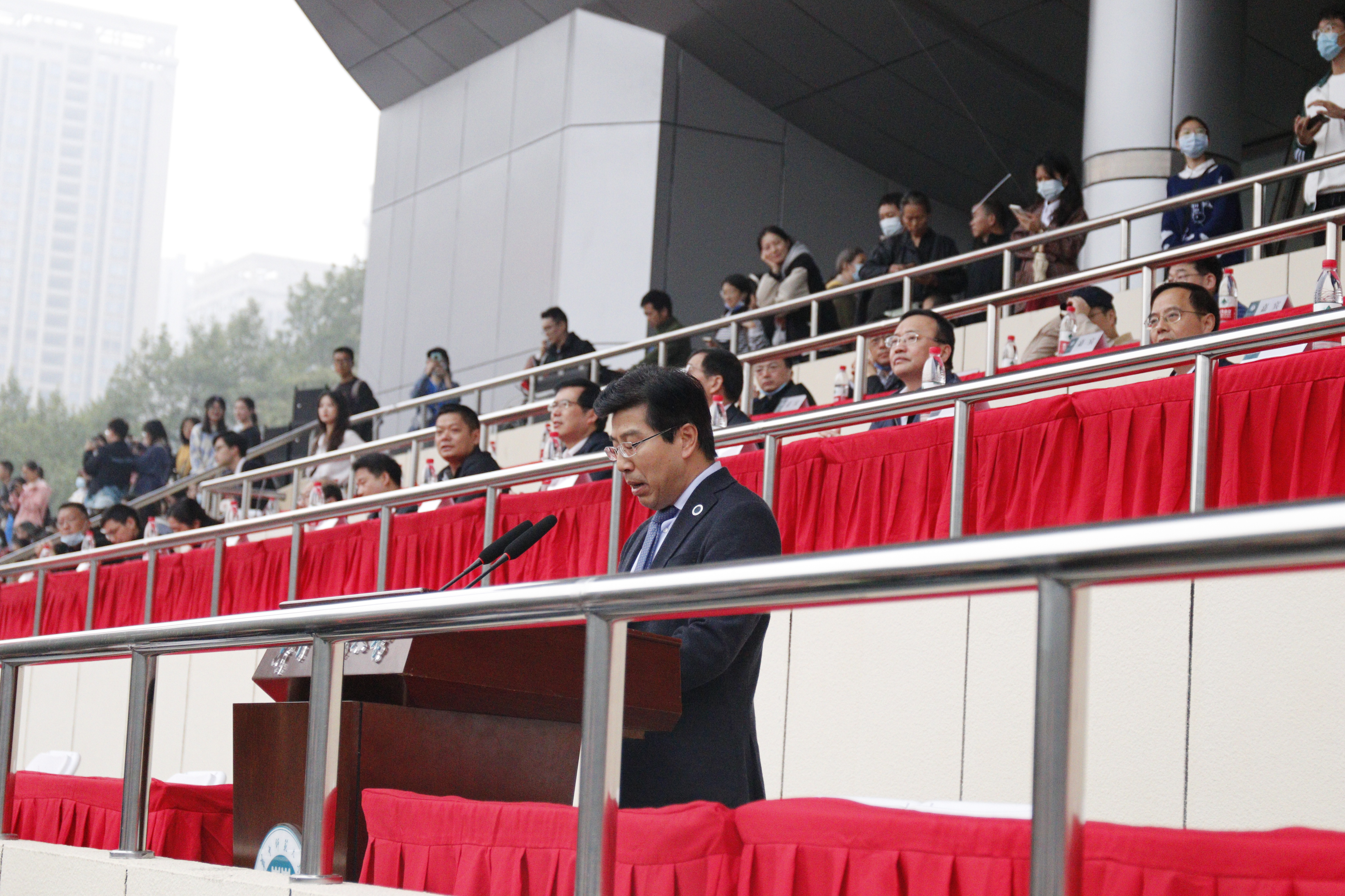 国歌庄严奏起,全体成员面向国旗,注目凝视,共唱国歌。面向各院学子,协办方化学学院党委书记邱宝国发表讲话。他说道:“体育是学校育人工作的重要环节,深植文化厚土的学生运动会体现了华师人的奋斗印记、拼搏印记和人文印记,成为桂子山一年一度的体育盛事,彰显了华师人的风采。”