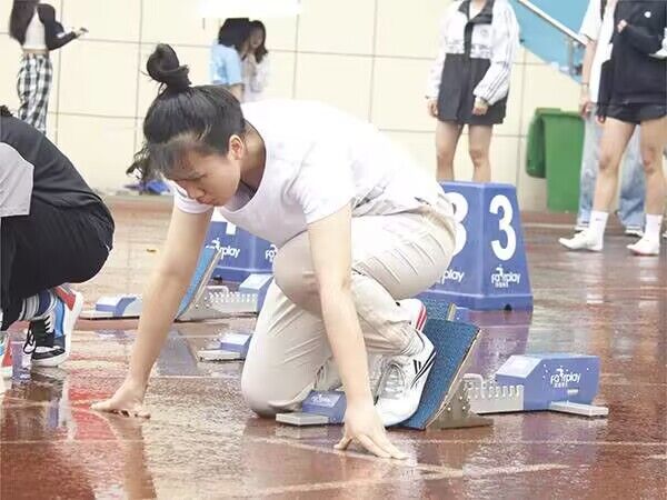 恰逢雨后,胡钰、圆圆、邓璠、彭晓艳代表物院参加女子100米预决赛。比赛前,运动员们屈膝仰头,蓄势待发;枪响后,运动员们奋力摆臂,冲向终点。最终,胡钰以14.06秒的成绩夺得冠军,邓璠和圆圆分别取得了14.30秒和14.70秒的成绩,位列第四和第六。