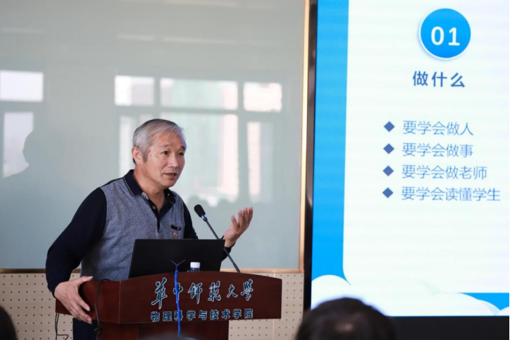 华大青年讯(通讯员 杨枫 贾一翀 罗可欣)4月16日,物理科学与技术学院78级校友、被全国网友亲切地称为“活动的物理教案博物馆”的武汉市东湖中学物理特级教师程启明,受邀回到母校,参加物理学院“优师计划”主题班会暨“成长之路”校友分享会,为同学们带来“学为人师”主题报告。物理学院党委书记张明生,党委副书记曹阳、副院长兼22级优师计划班主任吴少平教授、物理教育研究所专任教师兼21级优师计划班主任乔翠兰副教授,本研各年级的学生代表和辅导员老师参加活动。本次活动由党委副书记马英主持。