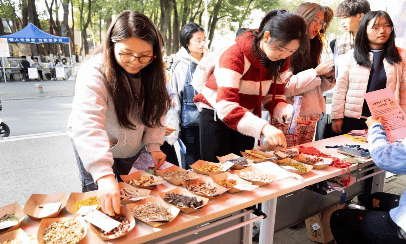 游园会还有手工体验香囊与暖饮分享。其中,手工体验区提供香囊制作服务,现场配备各类香料及包装物料,参与者充分发挥创意,亲手搭配香料、制作香囊,沉浸式感受传统手工艺的魅力。热茶驿站区则宛如冬日里的“暖心港湾”,始终暖意融融、人气十足。工作人员精心熬制了驱寒暖身的热饮,香气四溢的茶饮刚一上线便吸引了众多人员品尝。同时还进行健康知识科普,鼓励参与者在留言板写下健康寄语。各项互动项目井然有序、有条不紊地开展,既丰富了活动的服务内涵,也进一步拓展了师生的参与体验维度。