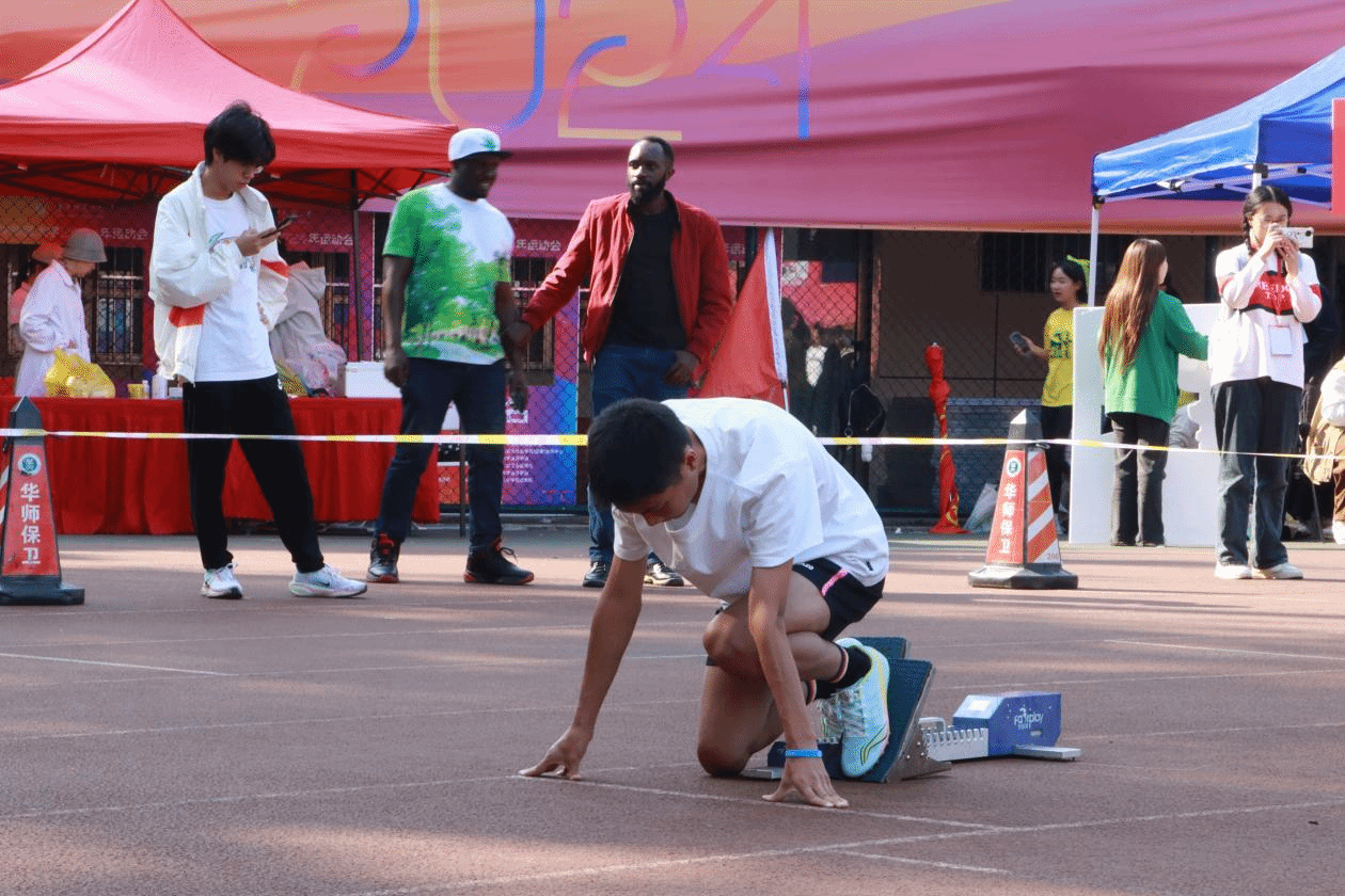 在正式比赛拉开帷幕前,运动员们纷纷展开了紧张而有序的赛前热身活动,他们伸展四肢、活动关节,力求将自己的身体调整到最佳状态。随着检录工作的结束,运动员们按照既定分组,逐一蹬上了那象征着力量与速度的助跑器。裁判员打出的清脆响亮的枪声划破天际,物院男子组的运动员们瞬间从助跑器上弹射而出。