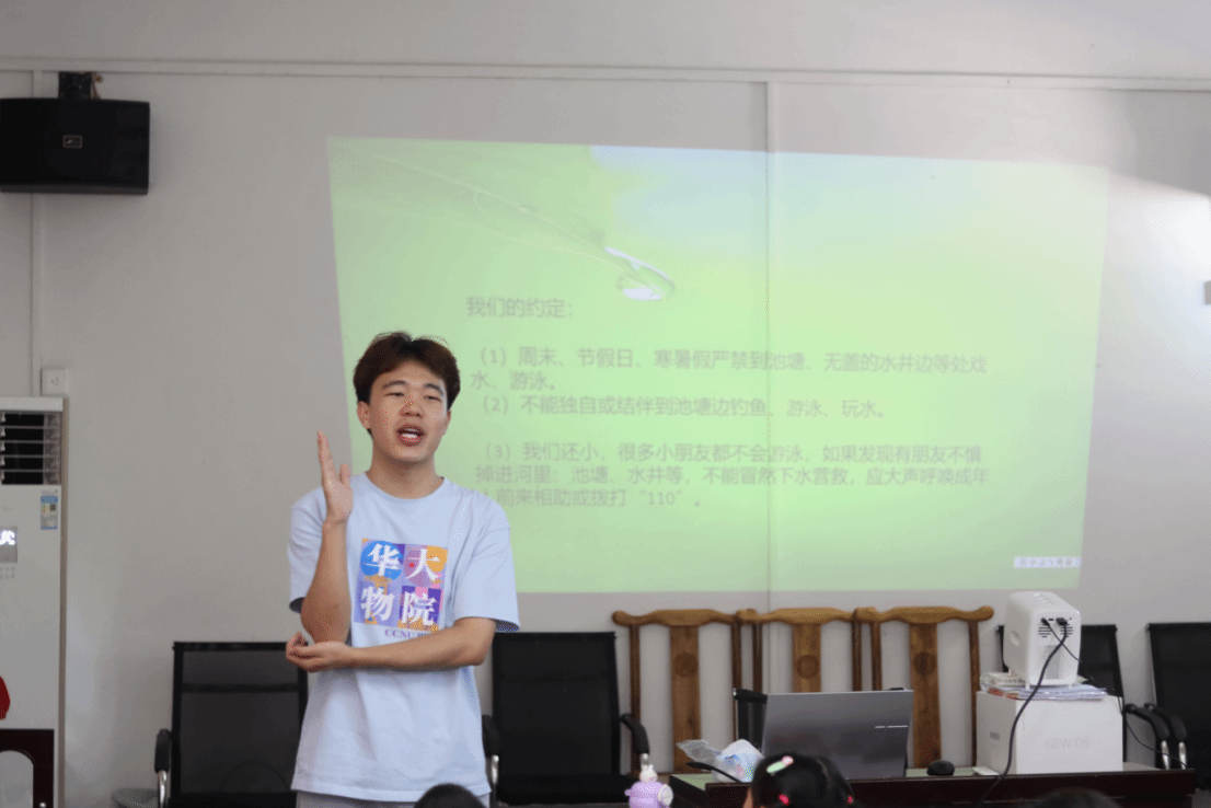 宝塔山村位于湖北省赤壁市柳山湖镇东南部,稻虾共作是全村移民主要经济收入来源之一,村中多池塘、稻田,溺水事故易发。针对这一实际情况,7月3日,实践队队员李悦男为孩子们带来了一堂防溺水安全教育课。李悦男通过展示溺水事故动画图片,直观揭示了户外游泳潜藏的巨大危险。为提升孩子们的避险能力,李悦男对比展示了标有“水深危险,禁止游泳”的野外水域图片与正规游泳场所画面,详细讲解野外游泳隐患,指导孩子们建立在安全场所游泳的观念。