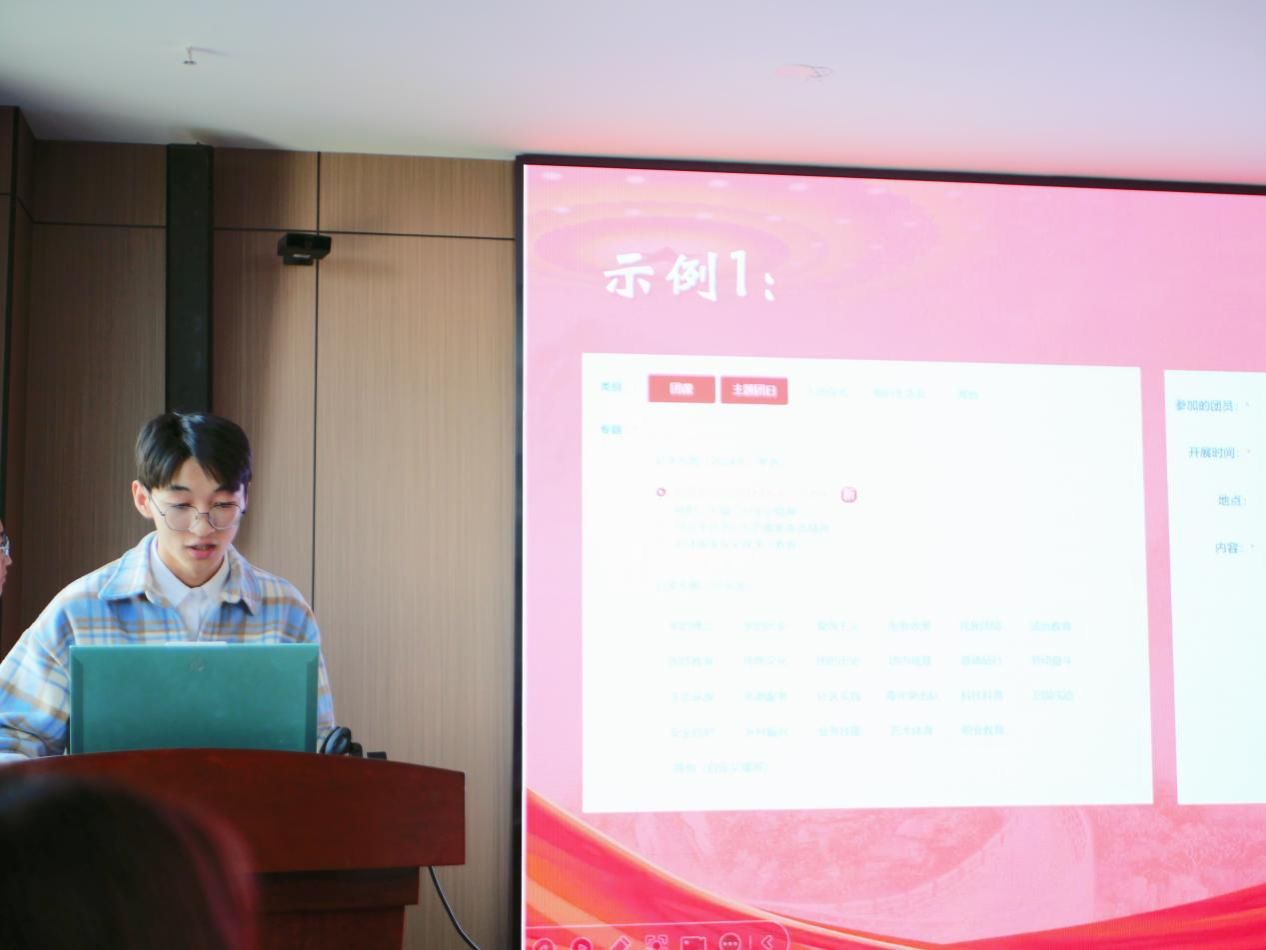 为推进团组织工作数字化转型与规范化管理,会议特设“智慧团建系统专题培训”环节。组织部负责人郑文彬通过现场屏幕演示与操作步骤拆解,重点讲解智慧团建系统的核心模块操作流程,其中既包括团日活动记录的上传方法,也涵盖团员信息的动态更新路径,帮助团支书提升系统操作能力。