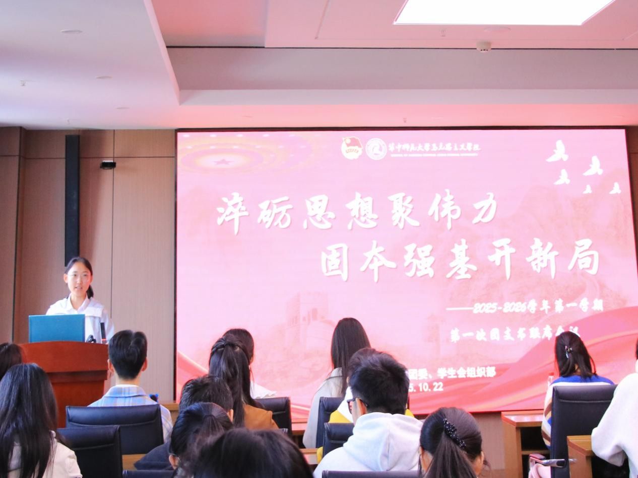 10月22日中午,“淬砺思想聚伟力,固本强基开新局”马克思主义学院(以下简称“马院”)2025—2026学年第一学期第一次团支书联席会议于文科科研楼407室召开。本次活动由马院团委、学生会组织部主办,组织部成员陈思然主持。