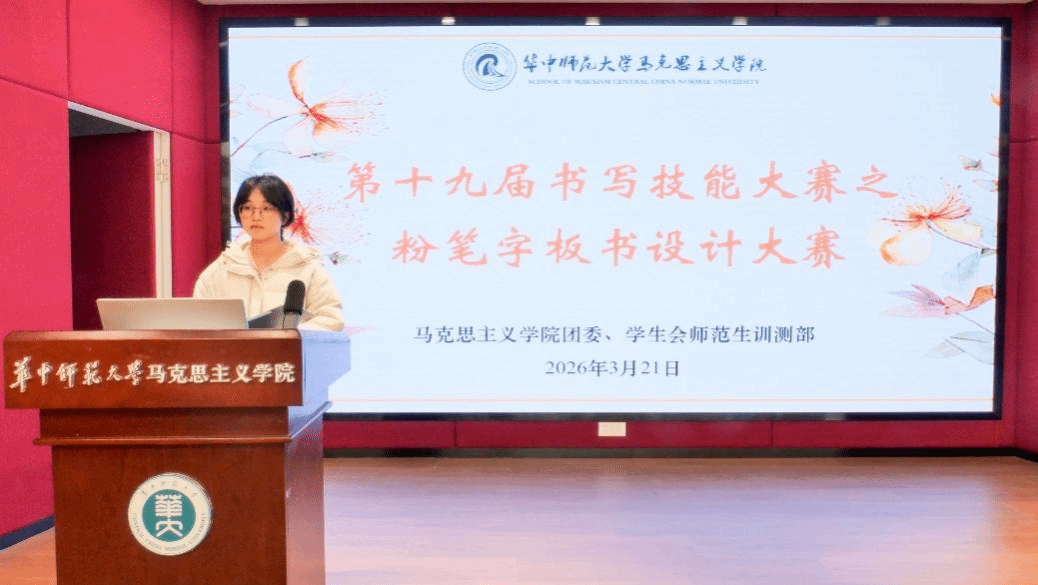 华大青年讯(通讯员 陈睿)3月21日,华中师范大学马克思主义学院第十九届书写技能大赛之粉笔字板书设计大赛在文科科研楼北楼104恽代英剧场举行。马克思主义学院2024级辅导员赵芸逸、2025级辅导员李泓桥,华中师范大学书写指导团成员包涵、林璐萍出席本次比赛并担任评委。本次比赛由马克思主义学院团委、学生会师范生训测部承办。