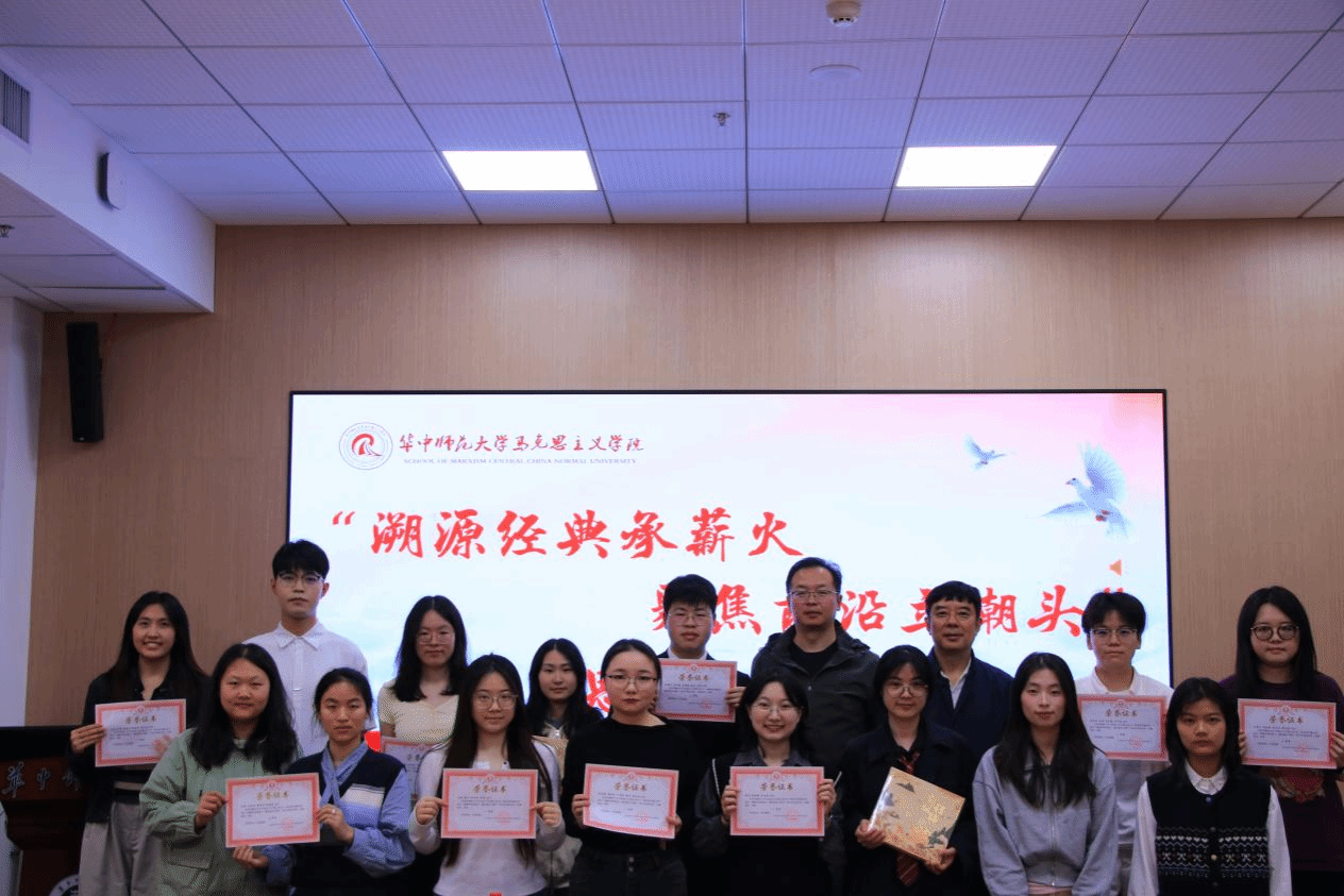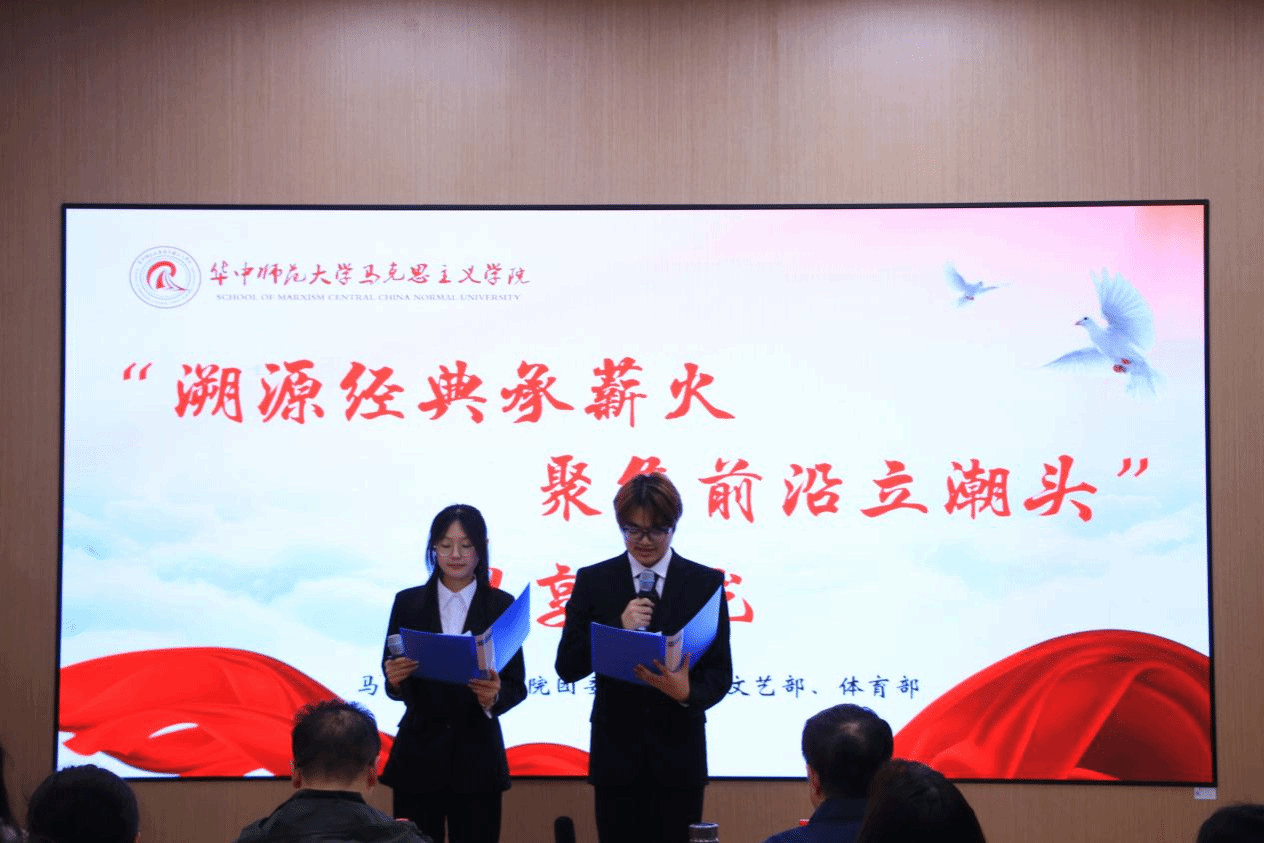 华大青年讯(通讯员 肖荷)4月25日下午,华中师范大学马克思主义学院(以下简称“马院”)“我为同学做实事”系列活动第四期“溯源经典承薪火,聚焦前沿立潮头”思享沙龙决赛在文科科研楼102教室举行。本次活动吸引了全校多个学院的15支参赛队伍同台展示,选手们通过主题演讲、情景剧、短视频等多样化形式,围绕经典原著研读与前沿思想探索两大主题展开精彩呈现。马院教授王忠文、副教授赵伟及研究生会学术部负责人童彤出席本次活动并担任评委。