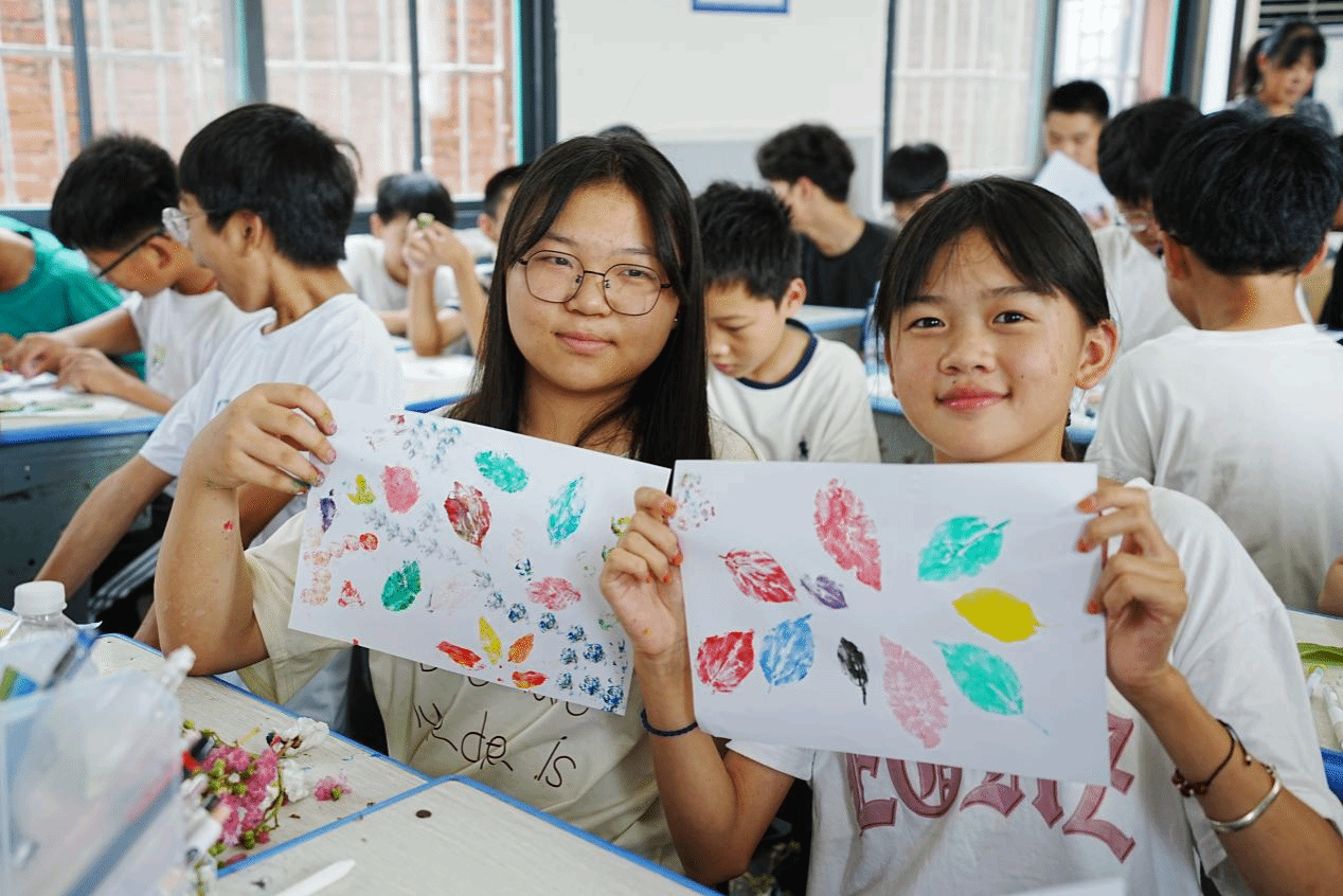 实践队队员们用双手传递着美育温度,设计了植物拓印、剪纸、折纸、风铃制作等课程,引导学生发现身边之美。在手工课堂上,队员仇杰铭带领学生用彩绳、纸杯、铃铛等材料自由创作,做出独具特色的风铃。针对历史悠久的剪纸文化与剪纸技法,队员师智豪从基础的对称折剪法教起,示范传统纹样的裁剪技巧,学生们认真专注,一件件形态各异的剪纸作品在手中成型。这些以实践为核心的美术课程,潜移默化地提升了学生的审美素养,为他们打开了一扇发现美、创造美的窗口。
