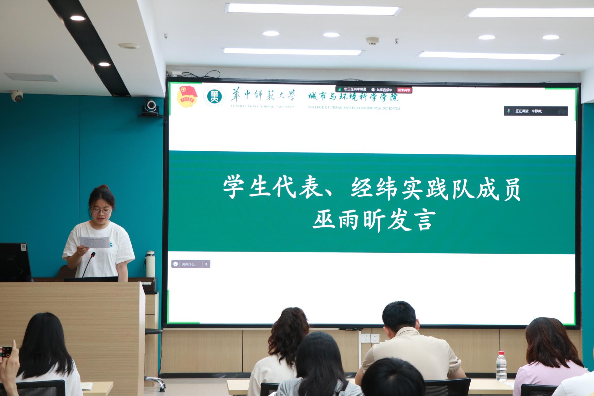 大会第三项,学生代表2022级地理科学专业本科生巫雨昕发言,她表达了投身社会实践的热情和决心,承诺将严格遵守各项纪律,时刻注意自身形象,恪守职责,以最饱满的热情投身实践活动,号召同学们积极响应社会需求,将青春的汗水播撒在祖国大地上。