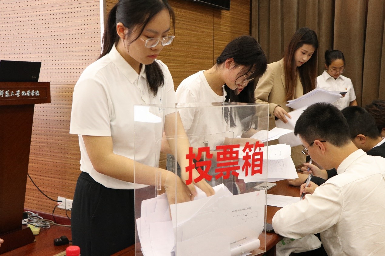 2024届团委副书记(学生)孙锦超、周晗、范睿涛,宣传中心主要负责人李继陈、唐妤婕依次进行自我介绍。2024届学生会主席团候选人王佳倍、庄耀杰、唐维敔、彭子晏竞选演讲。参会学生代表就主席团候选人与出席校级学代会学生代表进行投票选举。