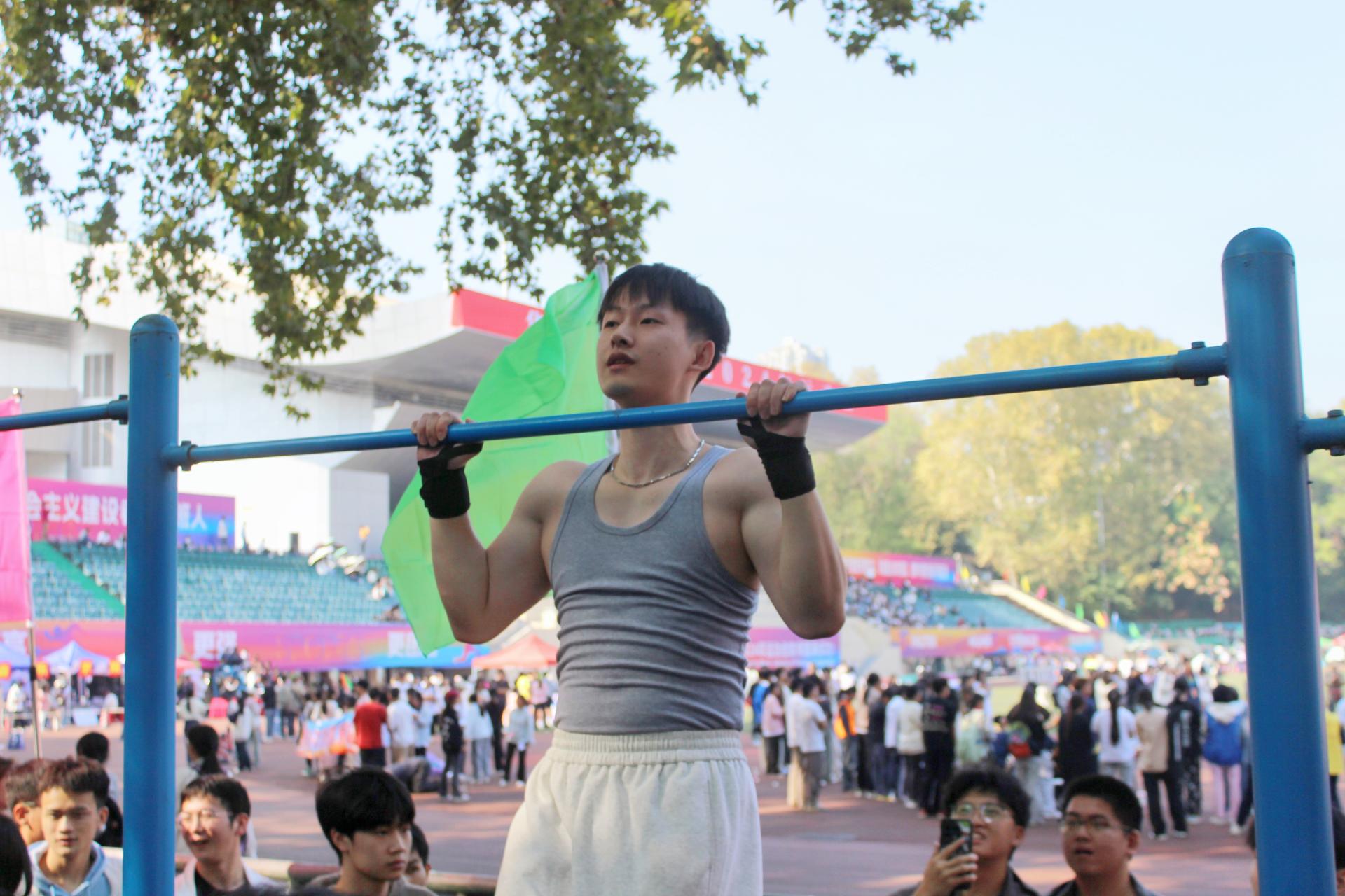 男子引体向上比赛也在进行中,城环学院共30名选手参赛。运动员们各展风采,奋力向上,咬牙拼搏,力争发挥出自己最好的水平。跳跃,抓杆,每一次发劲都是自我的超越。城环健儿们在这次比赛中磨砺自我、激发潜能,展现出青春的活力与奋进。