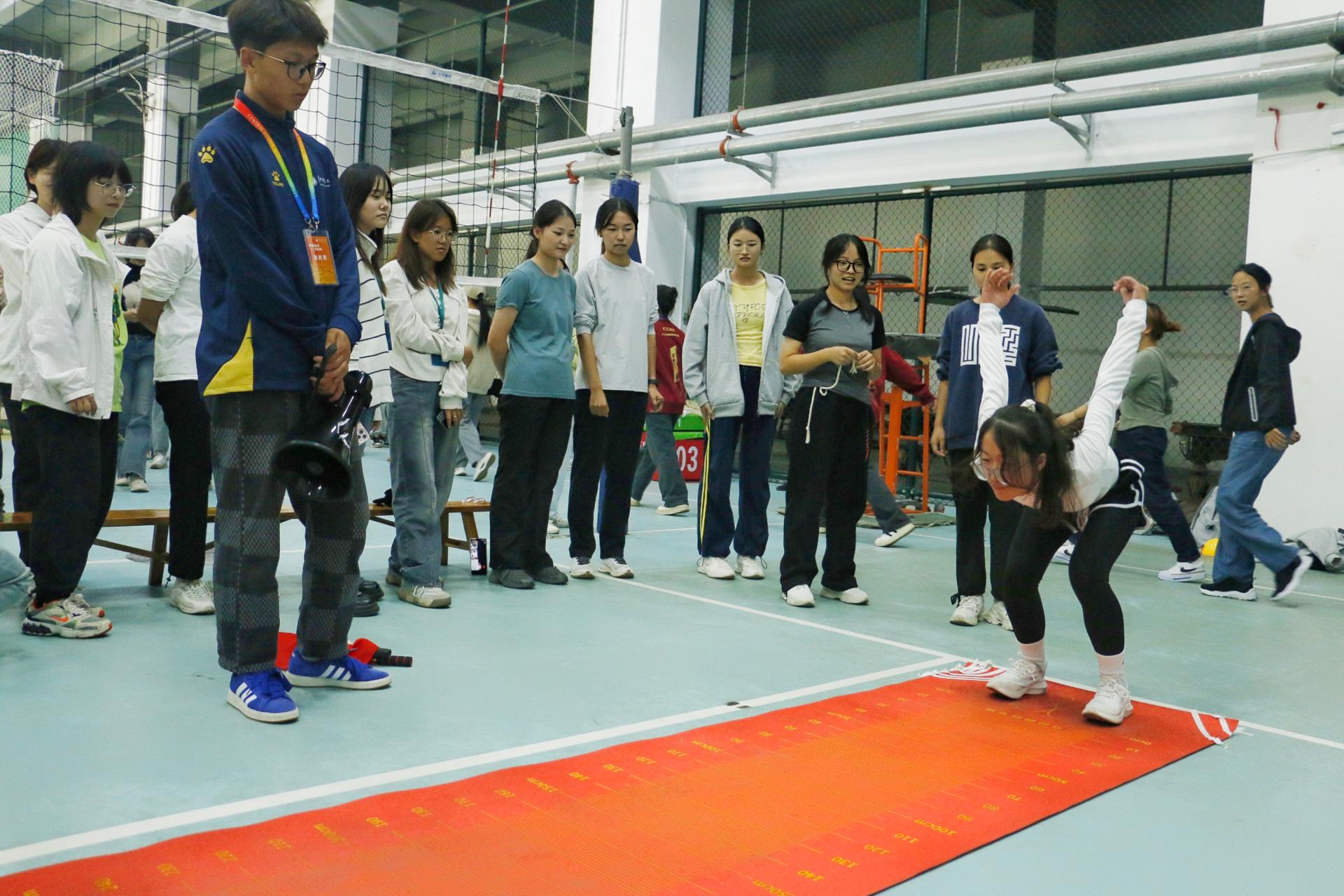 佑铭体育馆内,女子立定跳远比赛开始,城环学院30名选手参加比赛。比赛场上,选手们轮番上阵,接力跃出。起跳线前,运动健儿们立定站稳,屏息凝神,摆动双臂,奋力跃出,收紧核心,折叠身姿。一次次的跳跃,彰显出运动健儿们拼搏奋进的精神风貌。
