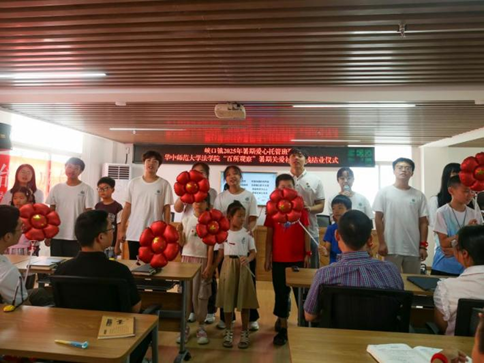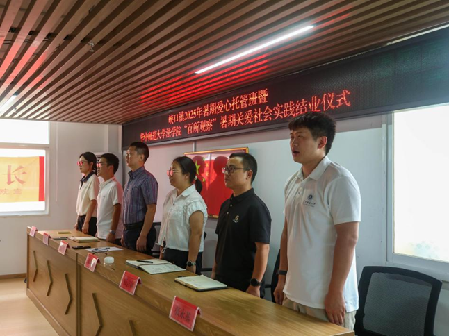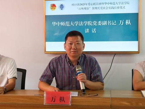 华大青年讯(通讯员 蔡圆)为推动乡村教育发展,以专业实践赋能乡村振兴,7月22日上午,华中师范大学法学院“百所观察”暑期关爱社会实践结业仪式在峡口镇居委会举行。本次实践活动依托学院专业优势,团队围绕基层法治建设与乡村振兴,顺利完成青少年爱心托管、司法所深度调研、村社普法宣传三大核心任务,让更多法治春芽在乡村沃土上茁壮成长。