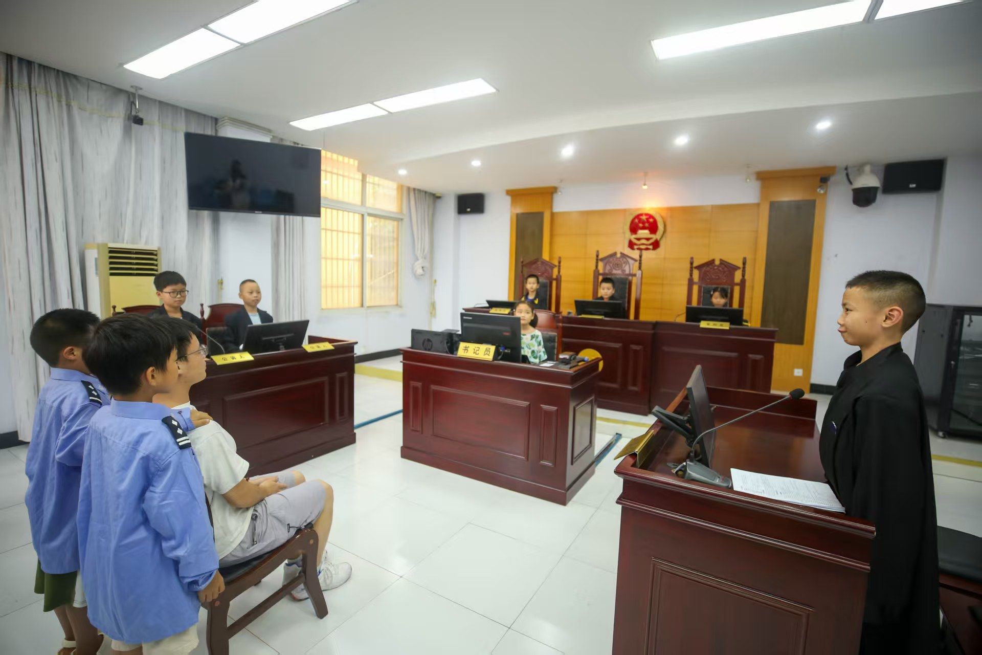 在课外,孩子们参加“宪法伴成长,法治护童心”系列活动,在国旗下诵读宪法并宣誓,学习《宪法伴我成长》和手势舞。峡口派出法庭举办的模拟法庭里,“小律师”“小检察官”围绕“游戏诈骗案”交锋,体验司法程序的严谨与公正。期间,队员们开发了特色法治课程包8套,形成包含教学方案、案例库、评价工具在内的标准化法治教育资源包。