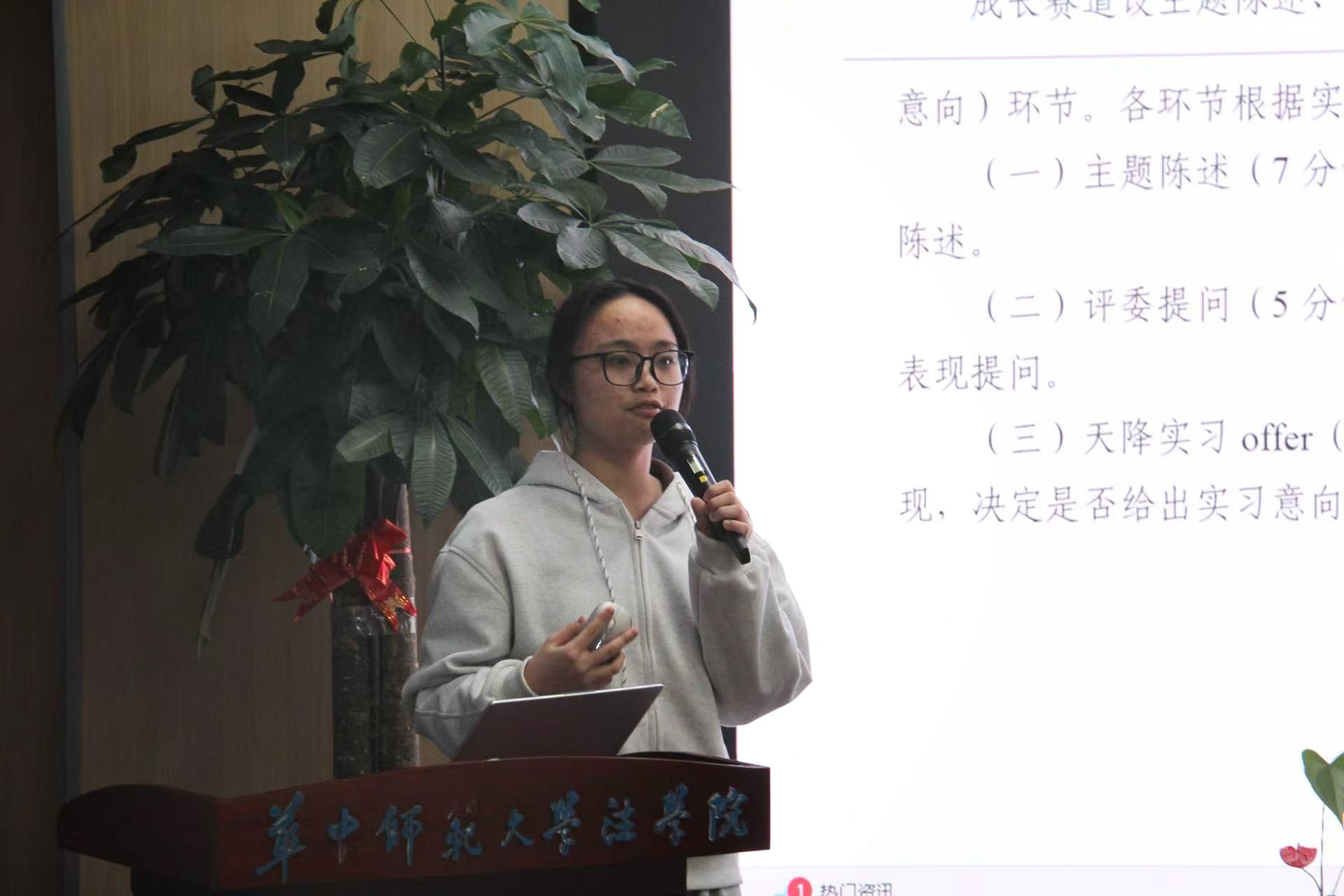 11 月 6 日,法学院灋行生涯规划与学习发展中心邀请第二届全国大学生职业规划大赛金奖获得者叶柔妘在学院一楼开展“成长赛道备赛经验分享会”。作为大赛的佼佼者,叶柔妘同学以自身参赛经历为蓝本,逐一拆解 “成长赛道” 重难点。针对备赛全流程,细致揭秘核心要点;并就同学们关于时间规划、能力提升、心态调整等方面的困惑,用“靠着反复打磨作品逆袭晋级”的真实经历,化解大家的迷茫与胆怯。