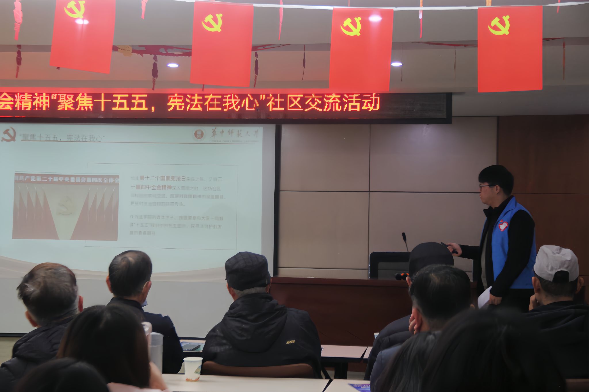 华大青年讯(通讯员 刘子涵)为深入学习贯彻“十五五”规划精神,庆祝第十二个国家宪法日,搭建校社联动桥梁,12月5日下午,法学院本研团总支社会实践部、青年志愿者协会联合法律硕士(法学)第一、第二党支部代表和学生志愿者,在洪山区银海雅苑社区举办“聚焦十五五,宪法在我心”社区交流活动,法学院的学生党员与社区党员、居民代表齐聚一堂,共学政策精神,共话社区发展。