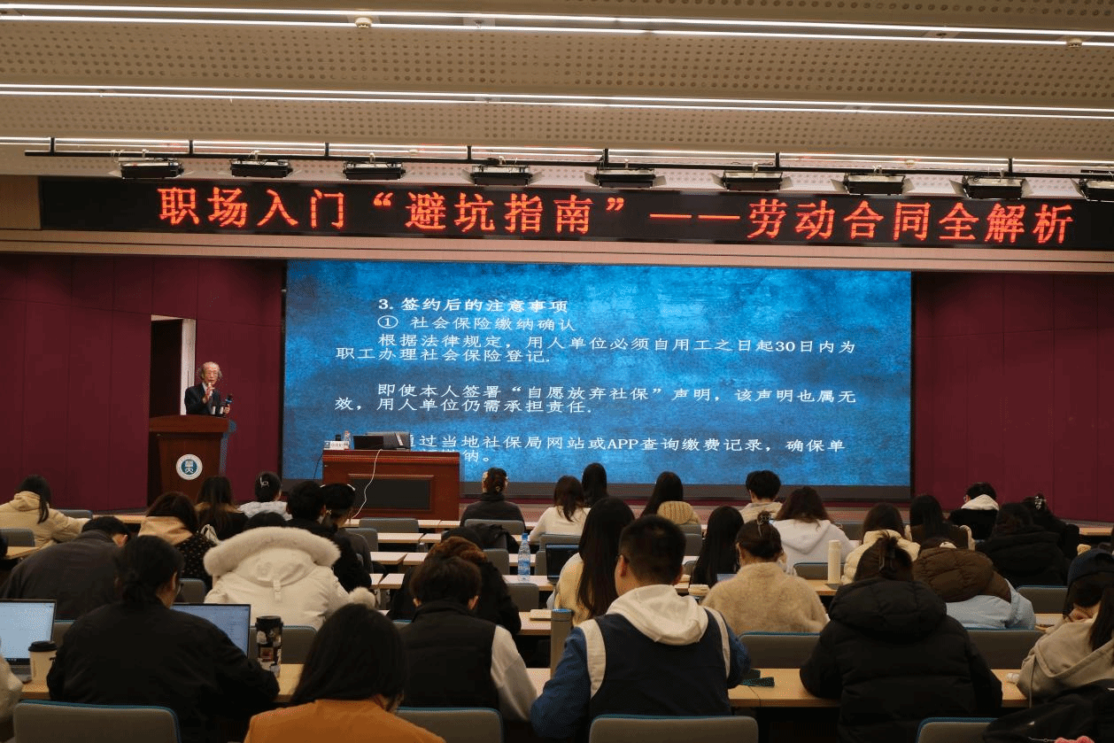 讲座伊始,徐绪柏以当前就业市场中劳动合同纠纷的典型案例为切入点,生动阐释了《劳动合同法》在职场维权中的核心作用。他结合法律条文与实务案例,聚焦初入职场群体最易遭遇的试用期约定不规范、薪酬结构模糊不清、社保缴纳不及时、竞业限制条款陷阱等高频风险点,系统梳理了劳动合同签订前后的关键法律问题。