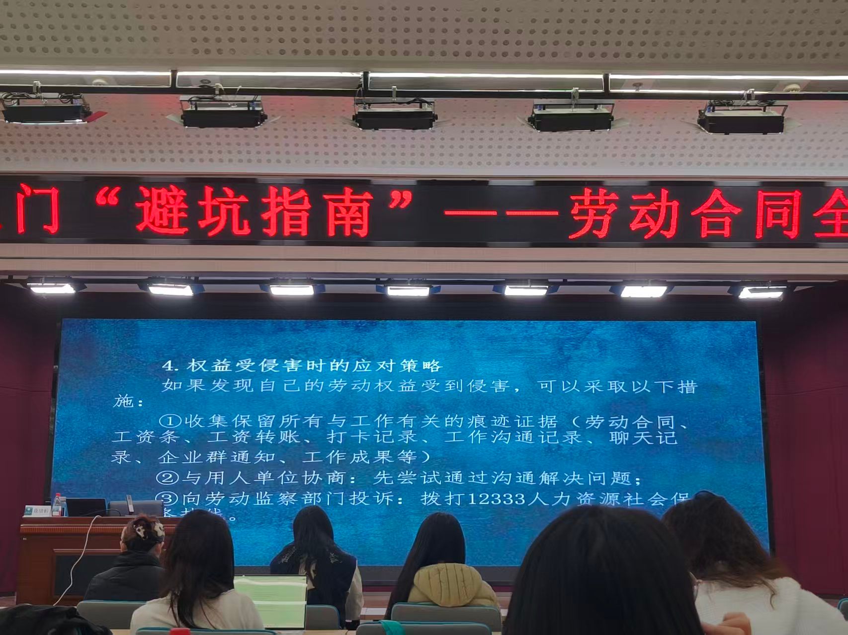 以提升法律素养、护航职场之路为核心目标,本次专题讲座精对接毕业生就业需求,为学子搭建了学习职场法律知识的平台,有效筑牢了毕业生职场权益“防火墙”,让法律成为同学们步入职场的“最强后盾”。作为培养法治人才的重要阵地,法学院始终高度关注学子职业发展,将法律实务服务与就业指导有机结合。