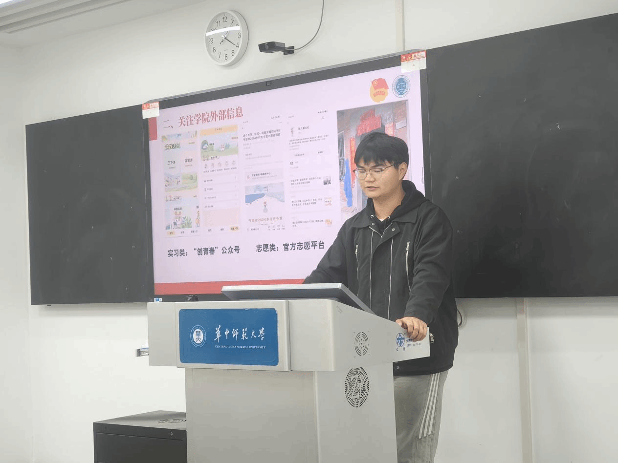 华大青年讯(通讯员 王咪)为深化共青团实践育人改革,搭建团学工作交流平台,12月14日,华中师范大学2025年第十六期共青团改革创新赋能荟在法学院101教室举行。本次活动以“扎根实践沃土,培育时代先锋”为主题,法学院团委书记张永基、法学院团委副书记(学生)黄子鑫以及研究生团总支组织部负责人肖博涵围绕实践育人分享经验与思考。