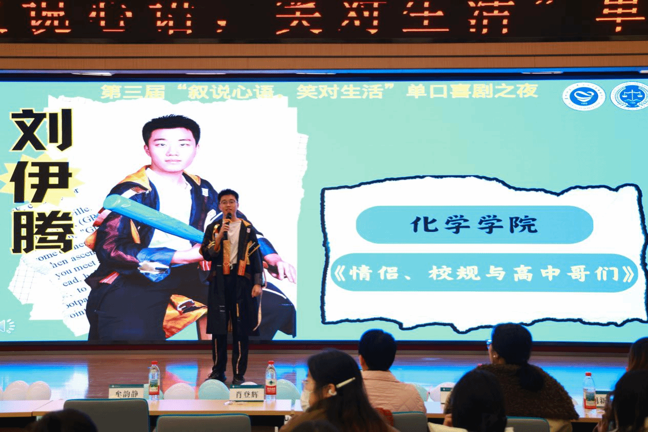 华大青年讯(通讯员 韩依婕)12月12日晚,第三届“叙说心语,笑对生活”校园单口喜剧之夜在文科综合楼101报告厅上演。本次活动由校心理健康教育中心与法学院“法苑一家”心理健康工作站联合主办。校党委学生工作部副处长吴建成、法学院副院长肖登辉、校心理健康教育中心牟韵静、袁丰卉,城市与环境科学学院辅导员刘新星,法学院辅导员姜孝文、陈志超出席活动,来自各院系的206名学生参与其中。