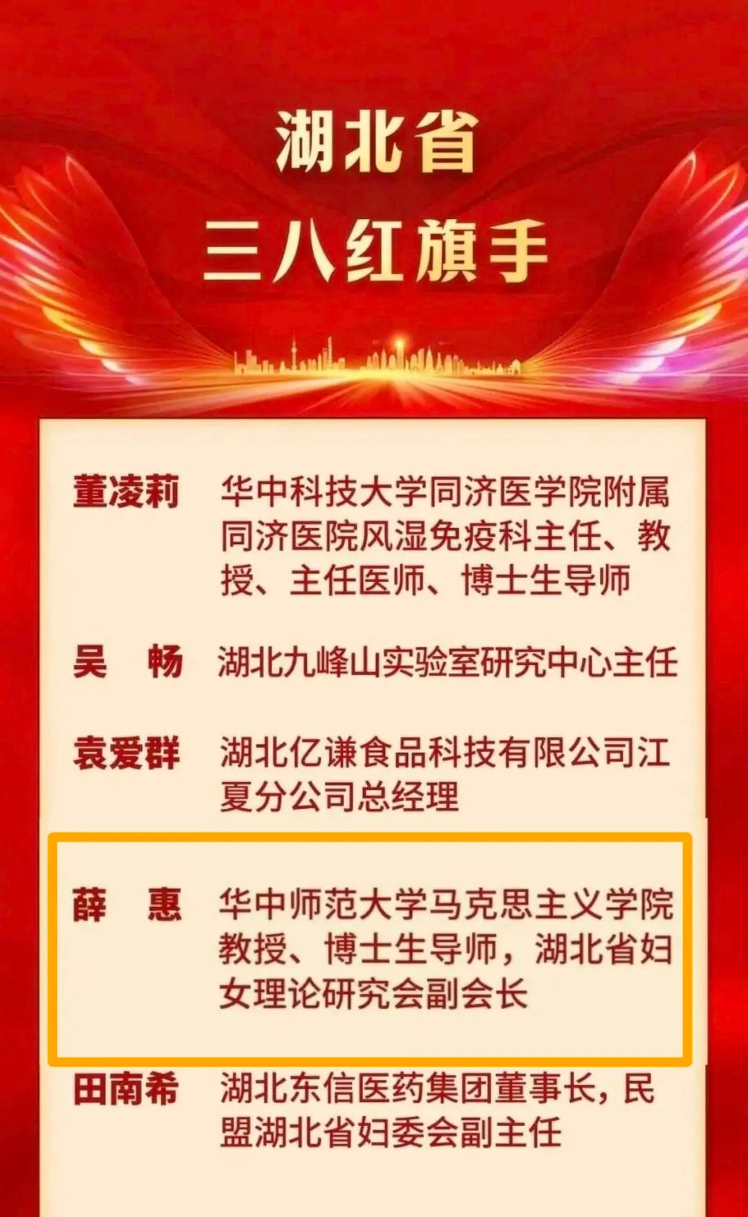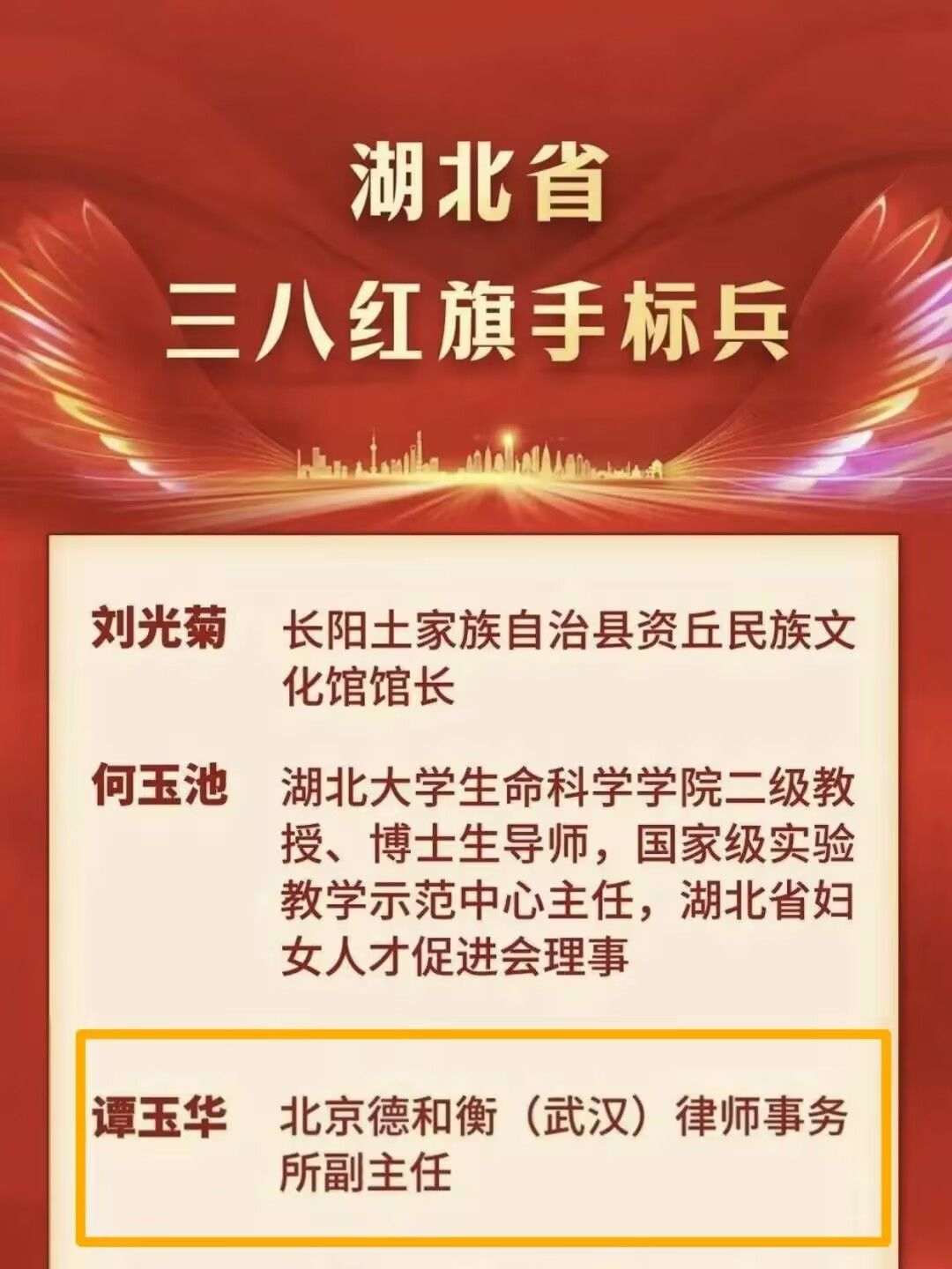 华大青年讯(通讯员 刘怡宁)3月6日,湖北省各界妇女纪念“三八”国际妇女节116周年大会在武汉召开。大会表彰全省先进妇女典型,共授予70个集体、100名个人相关荣誉。其中,法学院杰出校友、北京德和衡(武汉)律师事务所副主任谭玉华获“湖北省三八红旗手标兵”称号;法学院杰出校友、马克思主义学院教授、博士生导师薛惠获“湖北省三八红旗手”称号。