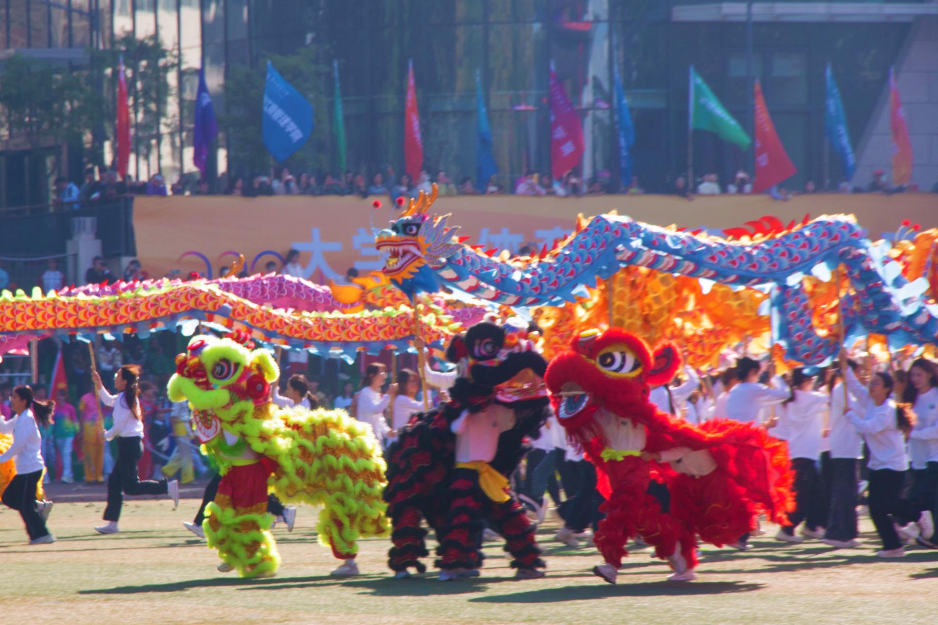 在舞龙舞狮表演中,他们身着鲜艳的服装,手持彩绸和龙珠,在操场上演绎了一场气势恢宏的舞龙舞狮秀。只见“院龙”围着“院狮”形成壮观的圆形队列,运动员们随着音乐摆出变化多样、新颖有趣的造型,用精彩的表演点燃了全场的气氛。法学院舞狮运动员们踩着铿锵有力的锣鼓声,轻盈入场,流畅地完成了“转头摆腿”“追尾回正”“麒麟步”等动作,赢得了观众们的阵阵喝彩。