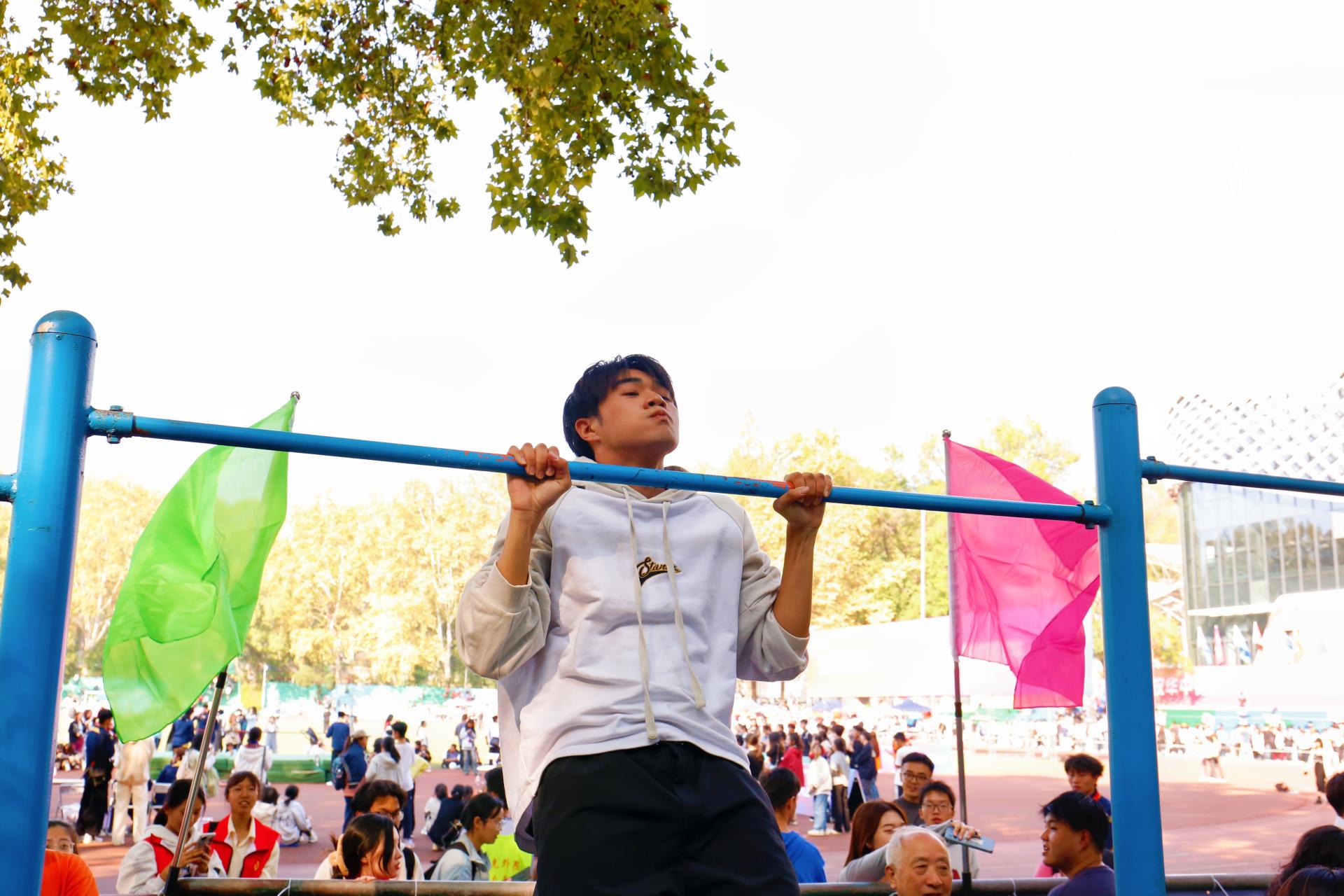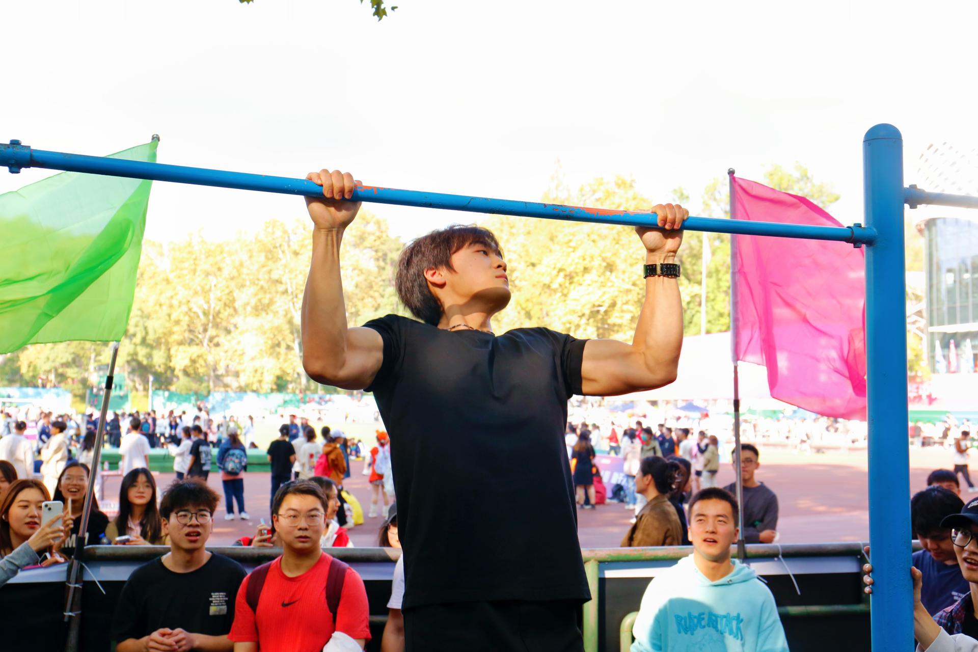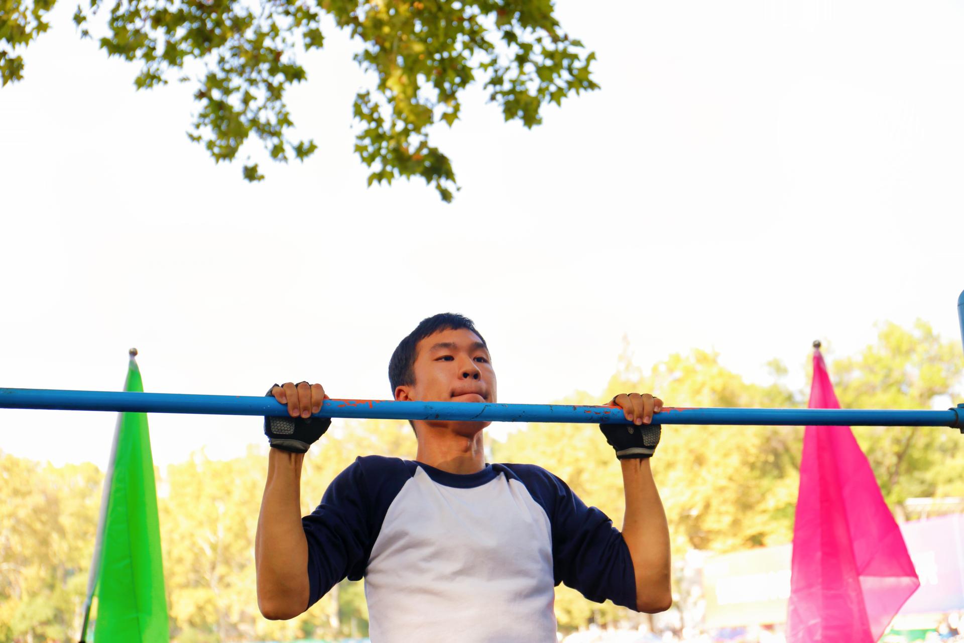 烈日下,男子组引体向上比赛在佑铭体育场南侧如火如荼地展开。法学院的参赛者们以高昂的斗志和自信的笑容迎接挑战,展现了他们内心的热情与坚定的意志。赛前,选手们通过充分的热身活动,为即将展开的激烈竞争打下了坚实的基础。