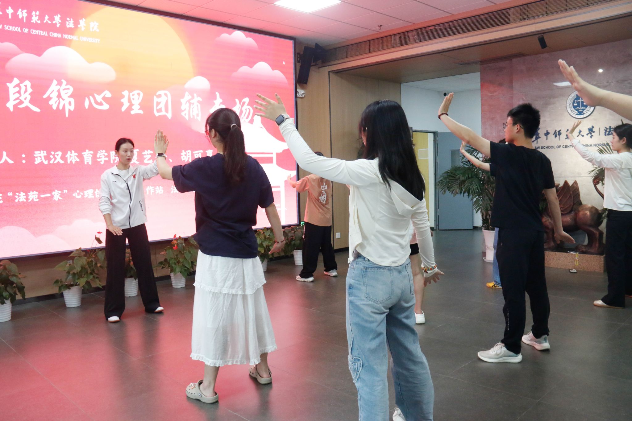 华大青年讯(通讯员 李雨恬 叶欣怡)5月21日下午,华中师范大学法学院“法苑一家”心理健康教育工作站携手法学院研究生会,在法学院一楼大厅成功举办“八段锦心理团辅专场”活动。本次活动特邀武汉体育学院夏艺丹、胡可嘉担任带领人,法学院四十余名同学踊跃参与,共同开启一场身心调和的健康之旅,通过动静结合的八段锦练习,同学们不仅体验了传统养生文化的精髓,更在快节奏的学习生活中找到身心调和的平衡点。