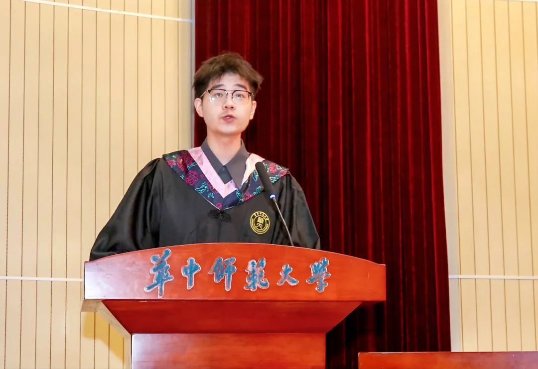 在学生代表发言中,2025届本科生代表吴炜彬以“法·学·院:我们的精神坐标”为题,将“法”“学”“院”三字作为切入点,展示了他对大学生活中学院、学业的别样感悟与对未来的真切祝愿。2025届研究生代表刘埸淇以“桂子山求学时光”为情感纽带,回顾了三年研究生生涯的成长经历。她以“忠诚博雅,朴实刚毅”的华师精神为基点,传递出对师友的感恩与对法治未来的坚定信念。